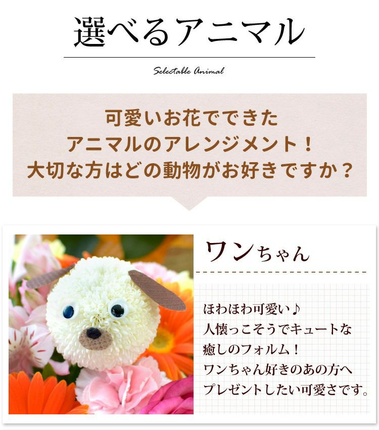 他の画像を見る 送料無料 お供え用 誕生日 アニマルモチーフ 生花アレンジ お花でできたキュートなアニマル★フラワーアレンジメント 送料無料 7種類の動物から選べる♪ アニマルフラワーアレンジ<1匹ver> 当店特別価格 ¥ 3,980 税込 会員価格あり Web会員様特別価格 ¥ 3,781 税込 詳細を見る お気に入りに登録する
