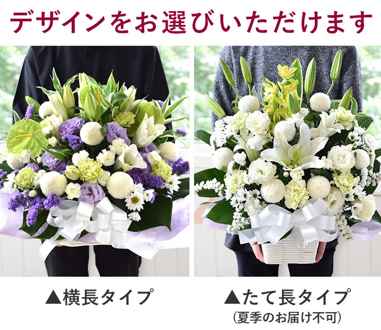 ●白のみ、にはグリーン系のお花が入ることがあります。 ●白+ブルーパープル、には、季節や入荷状況により、ブルー、またはパープルの花については、いずれかのお色になる場合があります。