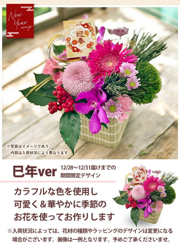 他の画像を見る 送料無料 生花アレンジ 年末お届け限定 おしゃれ&モダンなお正月生花アレンジ 2026 お正月飾り 3種から選べる生花アレンジメント おせち かがみもち ミニ門松風アレンジ 12/28~/31の間にお届け 当店特別価格 ¥ 3,980 税込 会員価格あり Web会員様特別価格 ¥ 3,901 税込 詳細を見る お気に入りに登録する