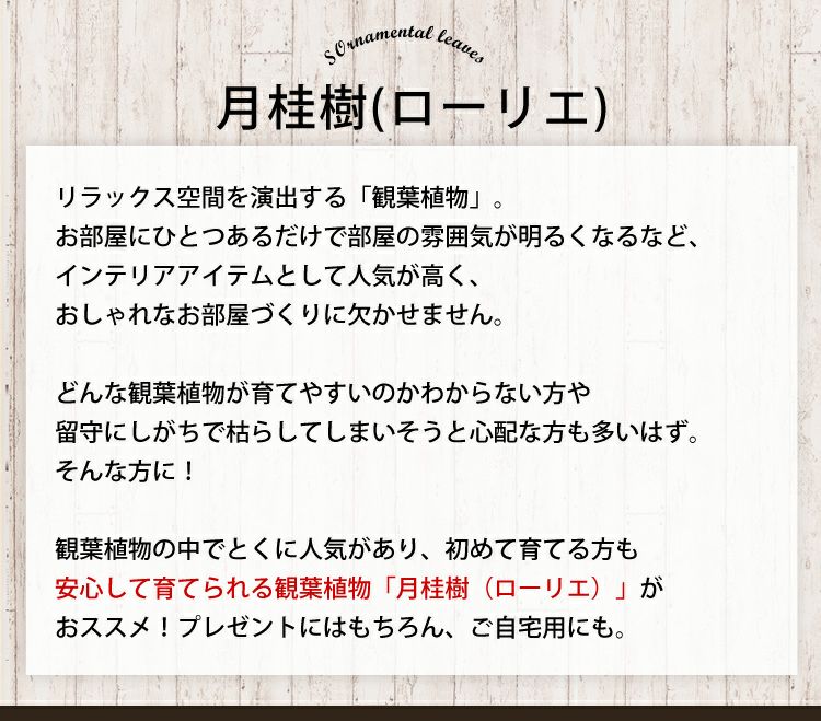 他の画像を見る 観葉植物 花言葉は栄光、勝利、名誉 月桂樹 鉢植え ローリエ ローレル 観葉植物 当店特別価格 ¥ 2,490 税込 会員価格あり Web会員様特別価格 ¥ 2,365 税込 在庫切れ 詳細を見る お気に入りに登録する