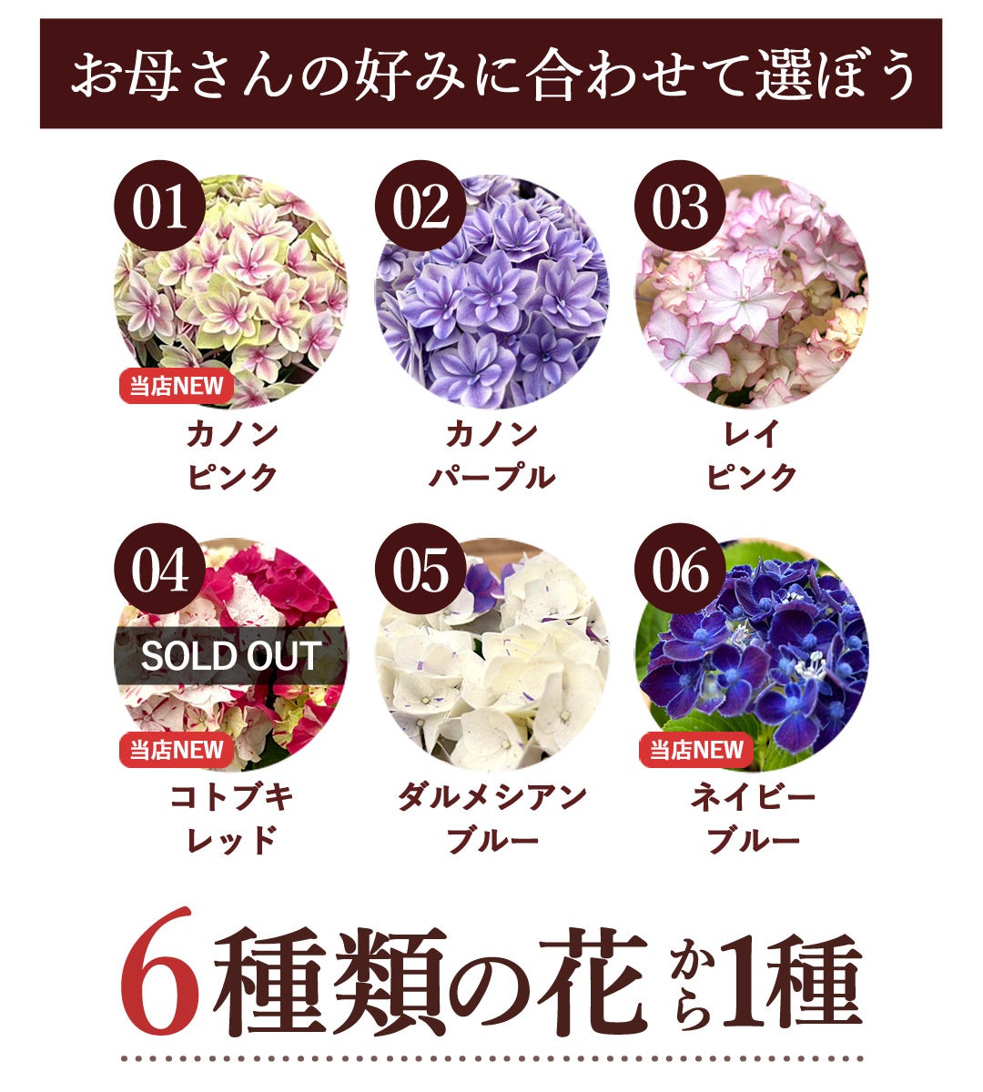 他の画像を見る 送料無料 鉢植え 母の日期間限定 アジサイで母の日後の梅雨の季節もお母さんを笑顔に♪ 母の日 2026 希少品種 選べる6種類 大栄花園さんの あじさい 4号鉢 in バスケット 当店特別価格 ¥ 4,280 税込 詳細を見る お気に入りに登録する