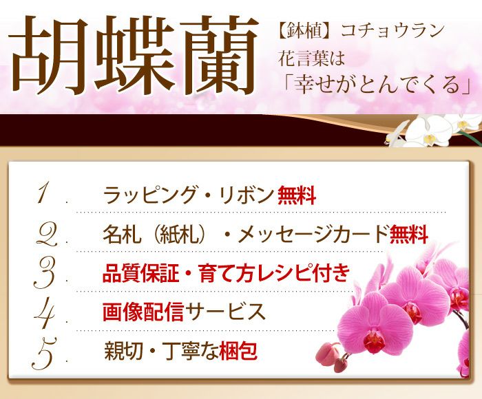 他の画像を見る 送料無料 誕生日 鉢植え 花言葉は「幸せが飛んでくる」 ミディ胡蝶蘭 産地直送 椎名洋ラン園さんの 花色と風呂敷のデザインが選べる 風呂敷包みの胡蝶蘭 2本立ち 当店特別価格 ¥ 6,980 税込 会員価格あり Web会員様特別価格 ¥ 6,630 税込 在庫切れ 詳細を見る お気に入りに登録する