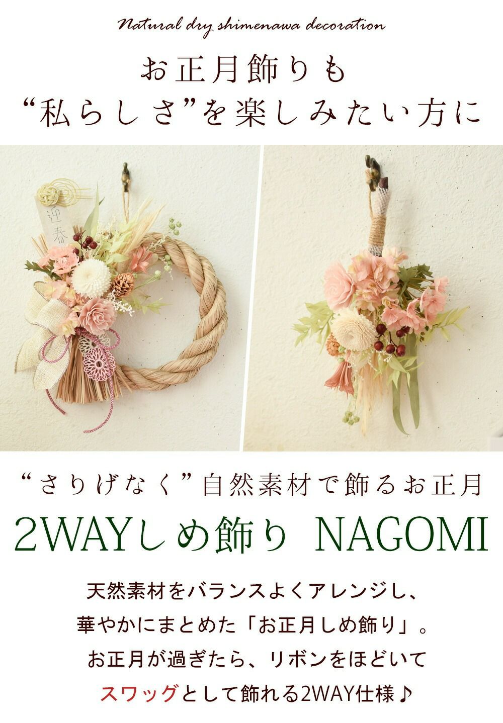 他の画像を見る 送料無料 造花 ドライフラワー しめ縄とスワッグに分けて飾れる! 正月飾り リース 2WAY しめ飾り NAGOMI 2026 [12/15届~] 当店特別価格 ¥ 4,780 税込 会員価格あり Web会員様特別価格 ¥ 4,540 税込 詳細を見る お気に入りに登録する