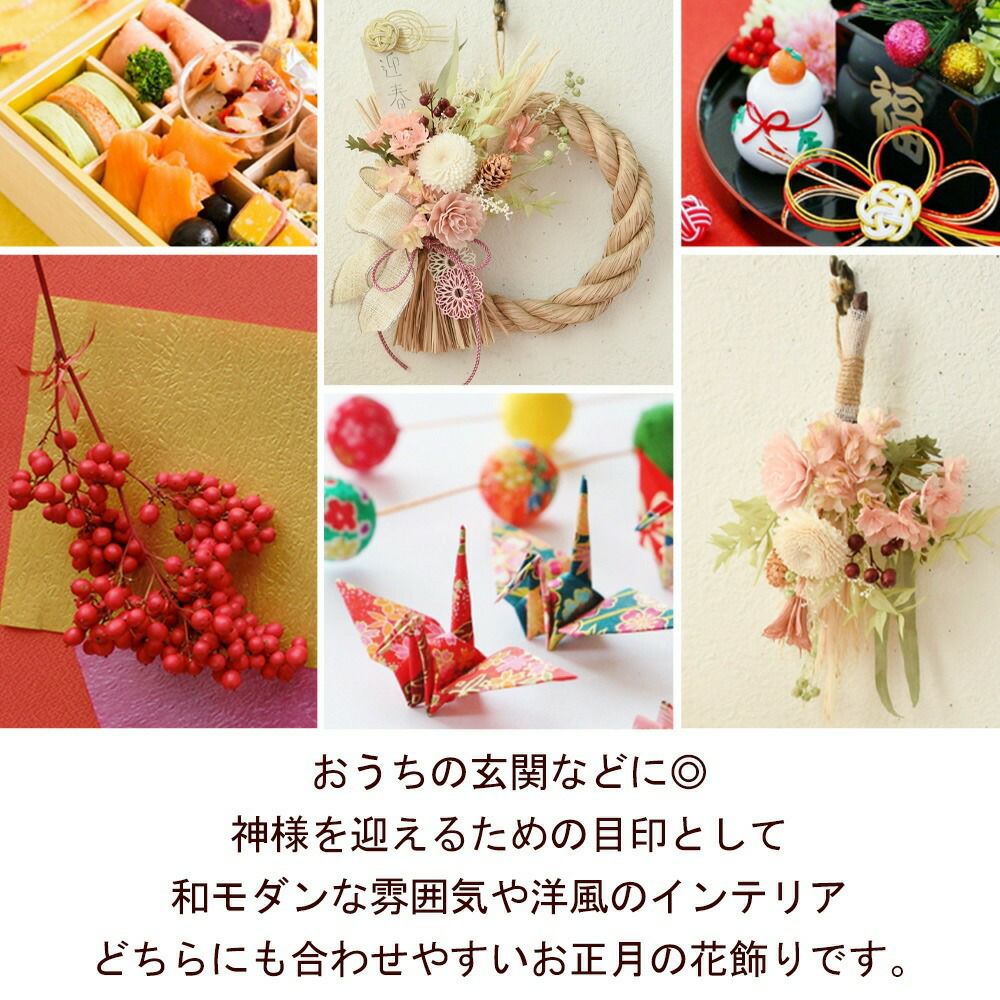 他の画像を見る 送料無料 造花 ドライフラワー 新年のお玄関をおしゃれに彩るアーティフィシャル お正月 新作 おめでた飾り 選べる3種類 [12/15~31届] 当店特別価格 ¥ 2,680 税込 会員価格あり Web会員様特別価格 ¥ 2,546 税込 詳細を見る お気に入りに登録する