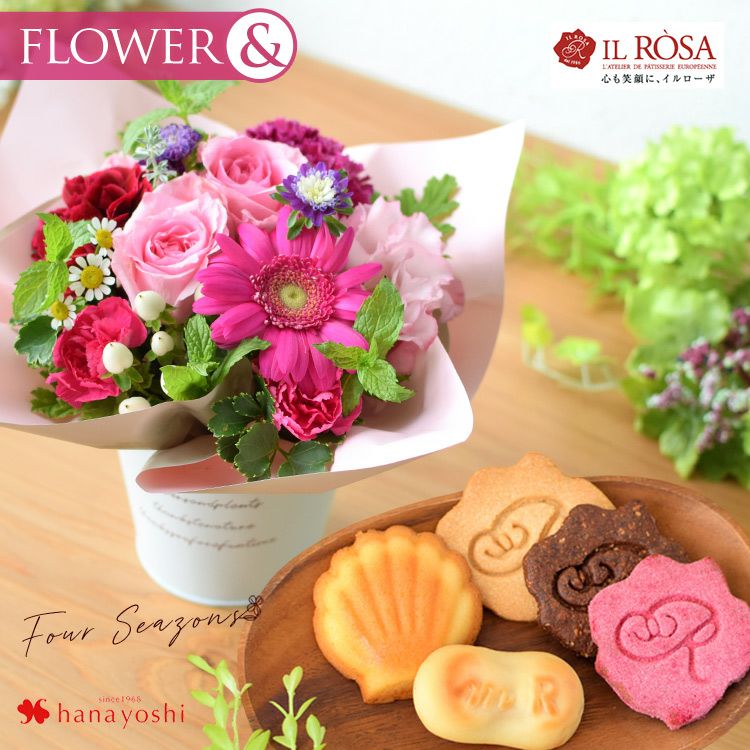 4. 送料無料 季節のおまかせ生花アレンジ と 焼菓子スイーツ セット
