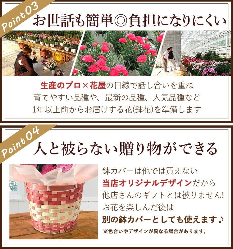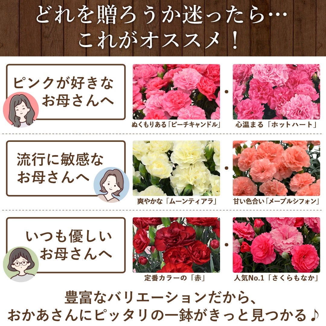 他の画像を見る 送料無料 鉢植え 母の日期間限定 母の日 新種や希少カーネーション登場! 母の日 2025 産地直送 選べる12種類 モリヒロ園芸さんのプレミアム カーネーション 鉢植え 5号鉢 in バスケット 当店特別価格 ¥ 3,290 税込 在庫切れ 詳細を見る お気に入りに登録する