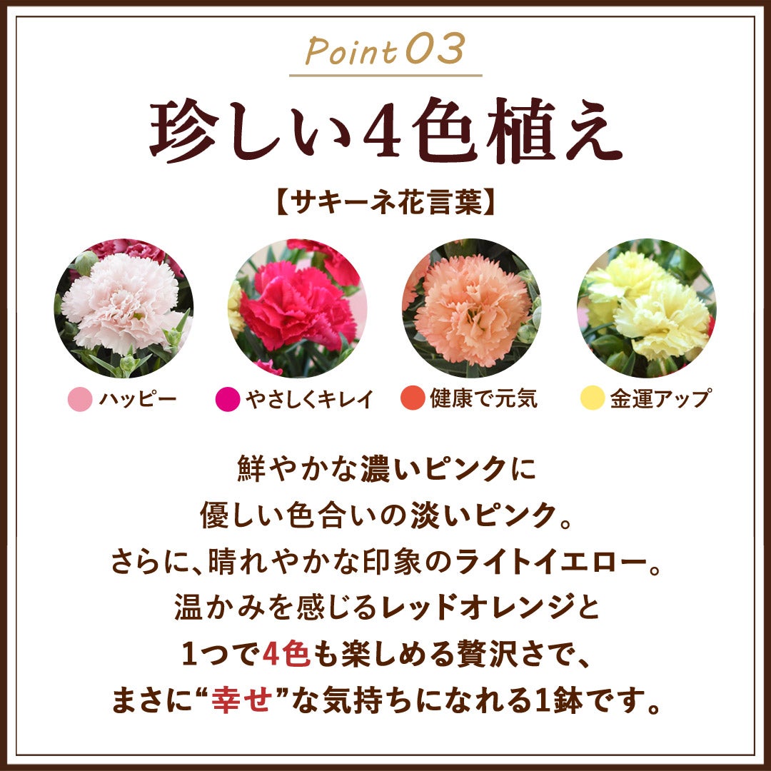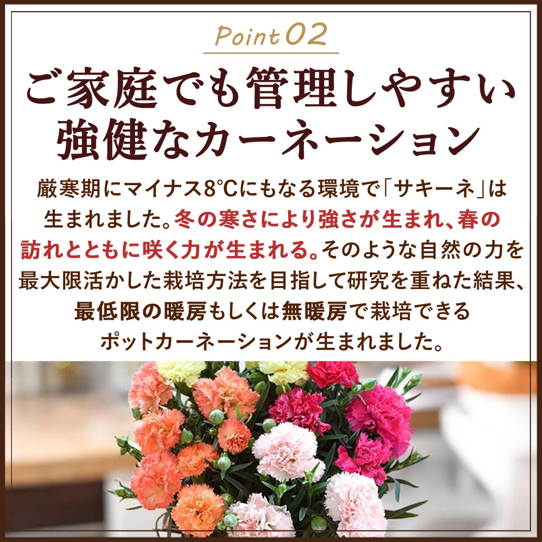 他の画像を見る 送料無料 鉢植え 母の日期間限定 DGsにも配慮した進化系カーネーション! 母の日 鉢植え 2026 カーネーション SAKEENE(R)の4色植え サキーネ 5号鉢 in バスケット 当店特別価格 ¥ 4,985 税込 詳細を見る お気に入りに登録する