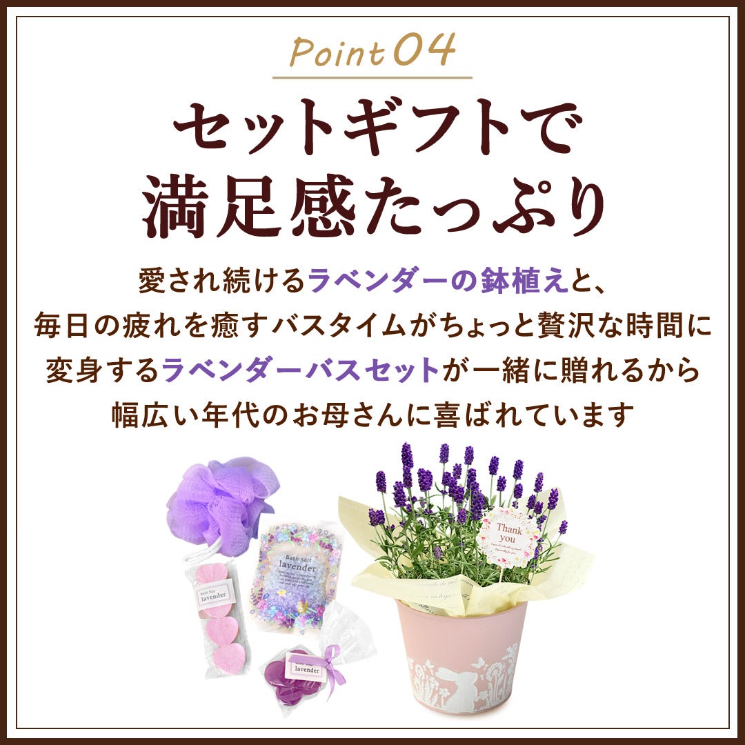 他の画像を見る 送料無料 鉢植え 母の日期間限定 香りを楽しむラベンダーづくしセット♪ 特早割 母の日 2026 ラベンダー 「ふらのブルー」 と ラベンダーバスセット 4種 当店特別価格 ¥ 3,985 税込 詳細を見る お気に入りに登録する