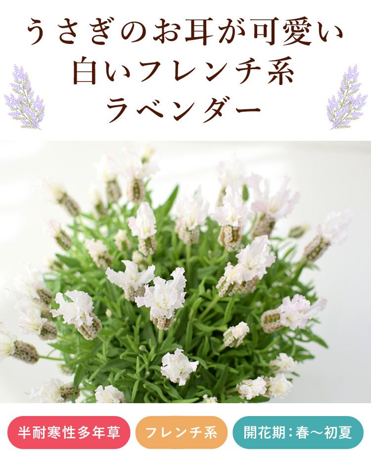 他の画像を見る 送料無料 鉢植え 香りも楽しめるギフト◎ 春の鉢花 送料無料 ラベンダー ラベラ ピュアホワイト 5号鉢 3/8~4/11お届け 当店特別価格 ¥ 4,530 税込 会員価格あり Web会員様特別価格 ¥ 4,304 税込 在庫切れ 詳細を見る お気に入りに登録する