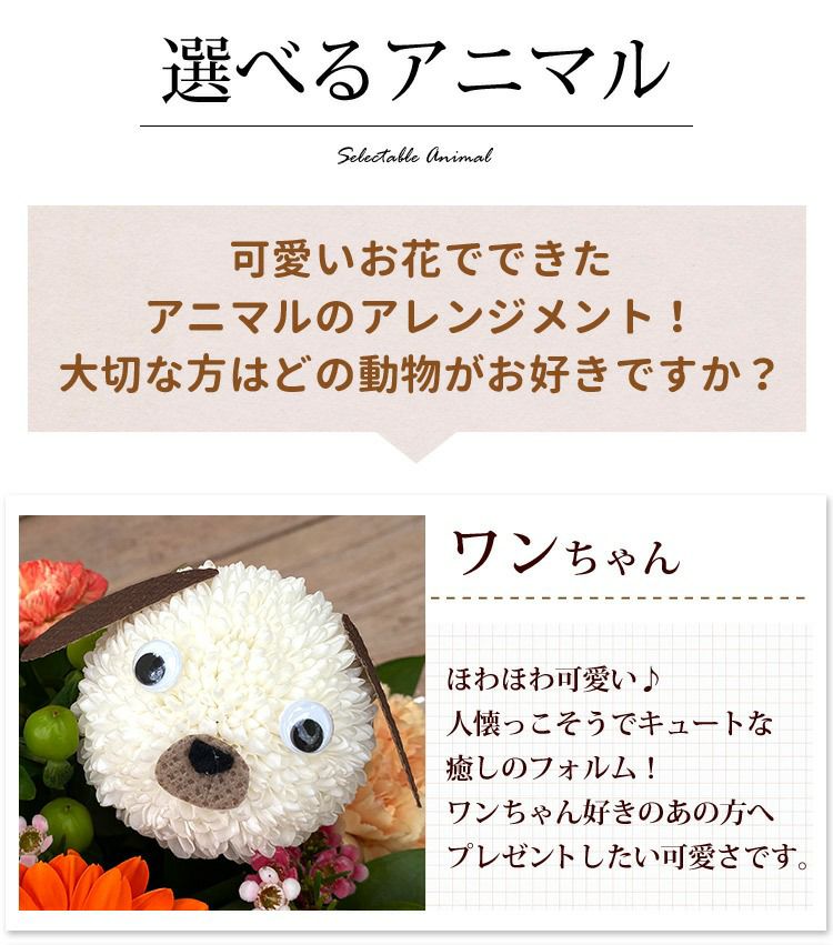 他の画像を見る 送料無料 お供え用 誕生日 アニマルモチーフ 生花アレンジ お花でできたキュートなアニマル★フラワーアレンジメント 送料無料 7種類の動物から選べる♪ アニマルフラワーアレンジ<1匹ver> 当店特別価格 ¥ 3,980 税込 会員価格あり Web会員様特別価格 ¥ 3,781 税込 詳細を見る お気に入りに登録する