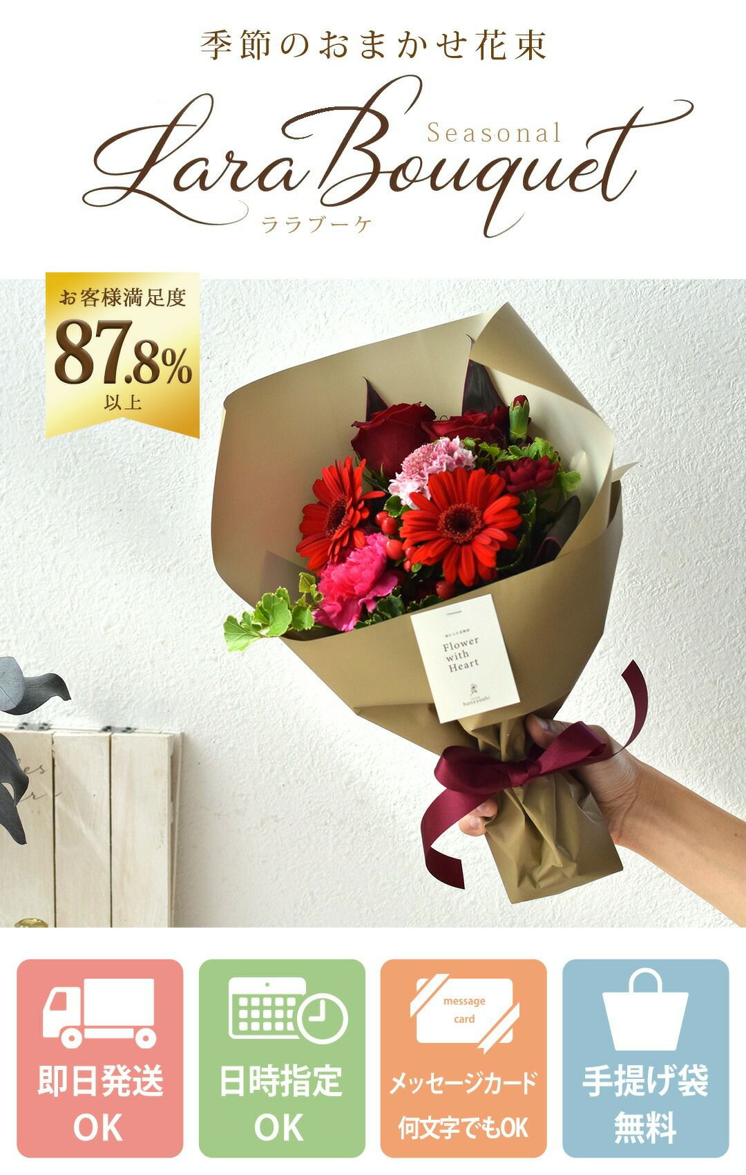 他の画像を見る 即日発送 送料無料 誕生日 生花花束 季節のお花がより引き立つデザイン! 花束 季節のおまかせブーケ ララブーケ 送料無料 当店特別価格 ¥ 3,480 税込 会員価格あり Web会員様特別価格 ¥ 3,306 税込 詳細を見る お気に入りに登録する
