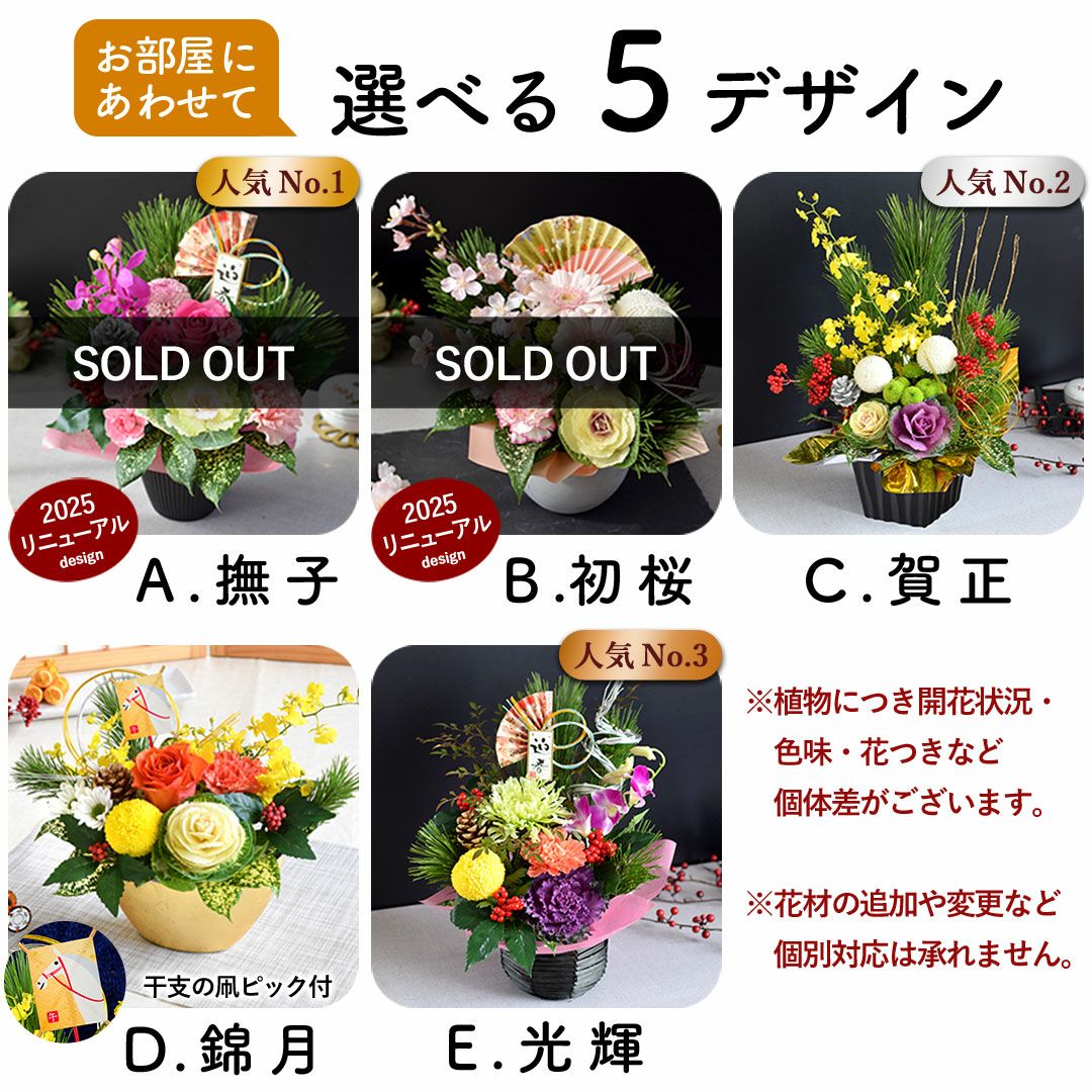 他の画像を見る おしゃれ&モダンなお正月生花アレンジ 正月飾り 2026 お正月 5種から選べる生花アレンジメント 12/28~/31の間にお届け 当店特別価格 ¥ 4,980 税込 会員価格あり Web会員様特別価格 ¥ 4,731 税込 在庫切れ 詳細を見る お気に入りに登録する