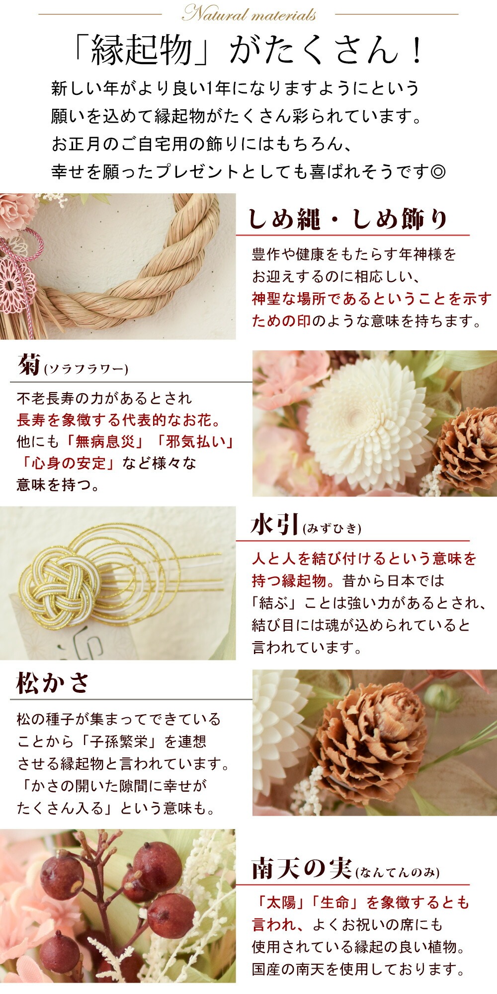 素材:プリザーブドフラワー・ドライフラワー・ソラフラワー・アーティフィシャルフラワー(造花)・自然素材・しめ縄・リボン・迎春ピック