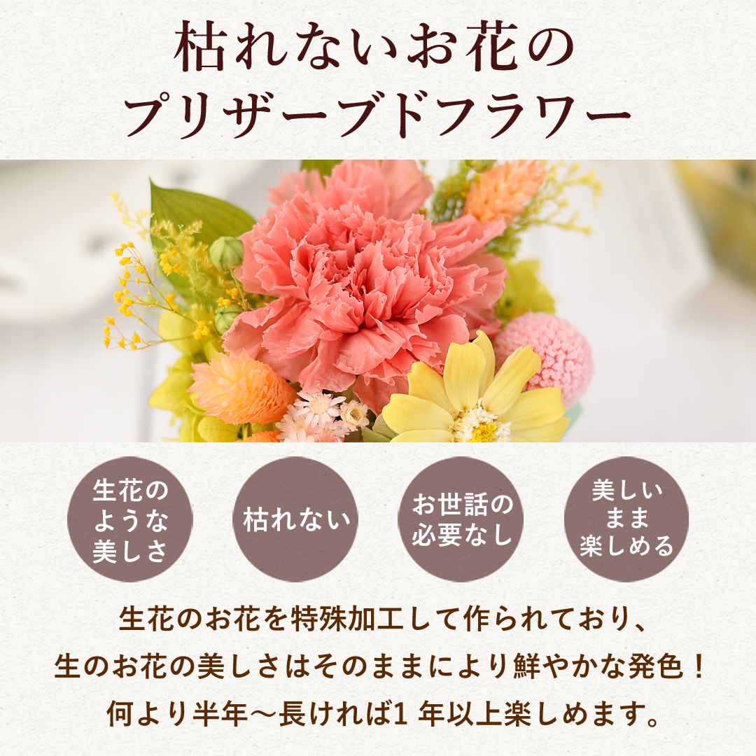花材:プリザーブドカーネーション/プリザーブドジニア/プリザーブドアジサイ/