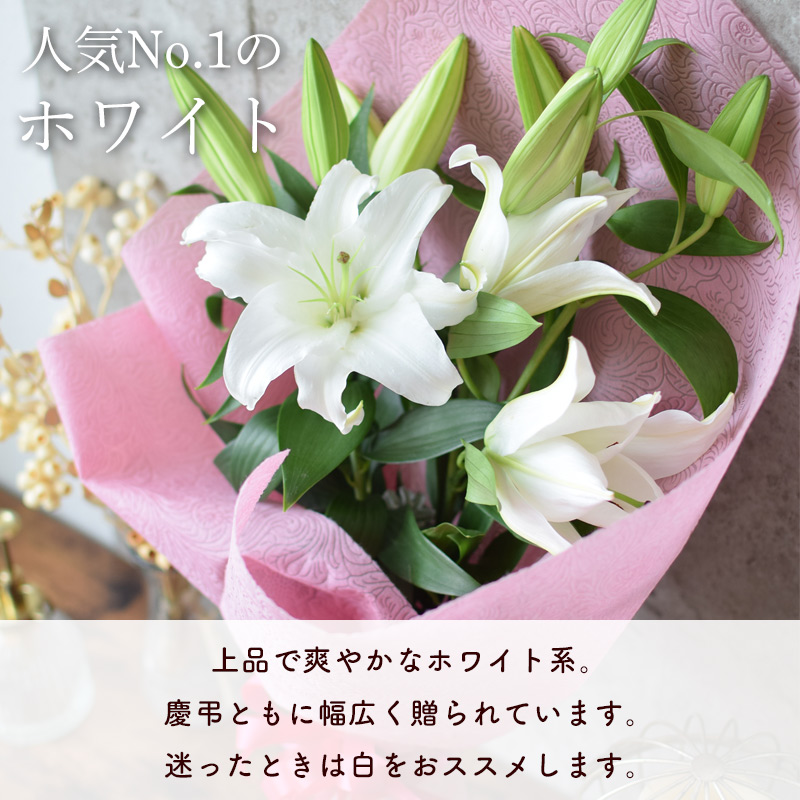 4. 送料無料 花束 大輪 オリエンタルリリーのブーケ <3本> 3カラーお供え と お祝い の花束 ユリ お盆 新盆 初盆 お彼岸