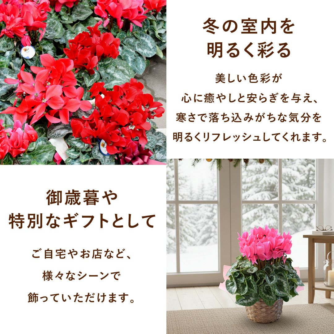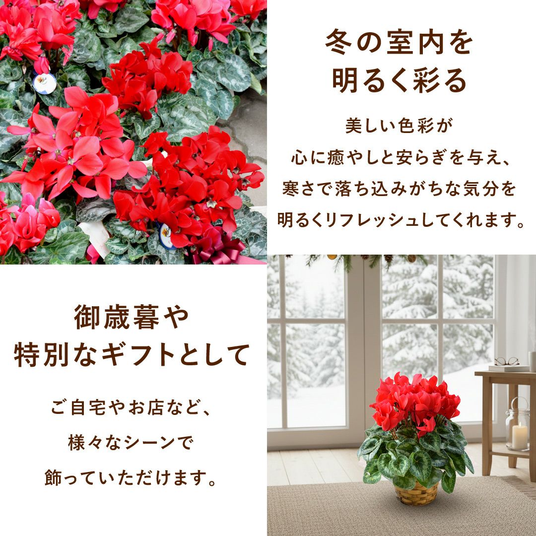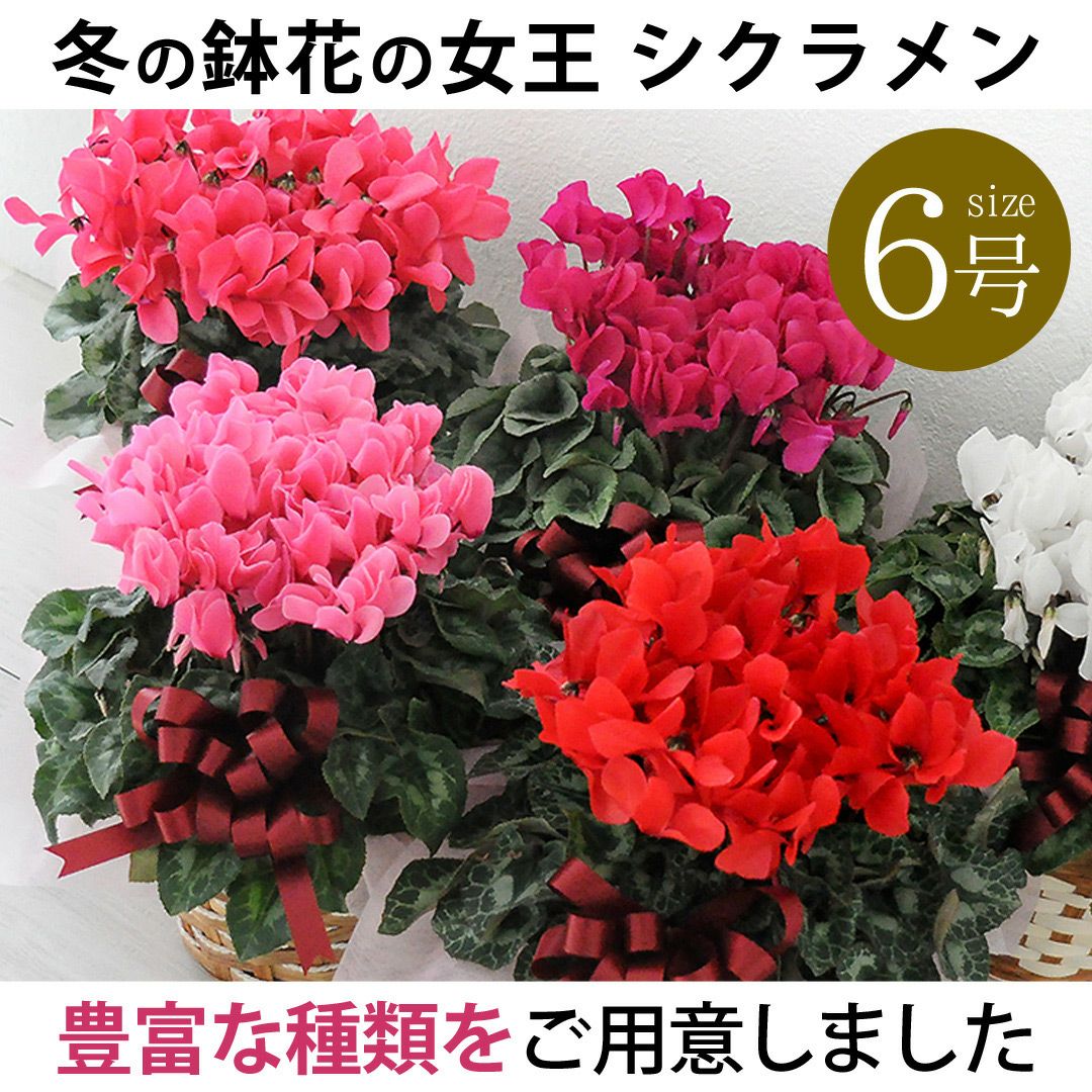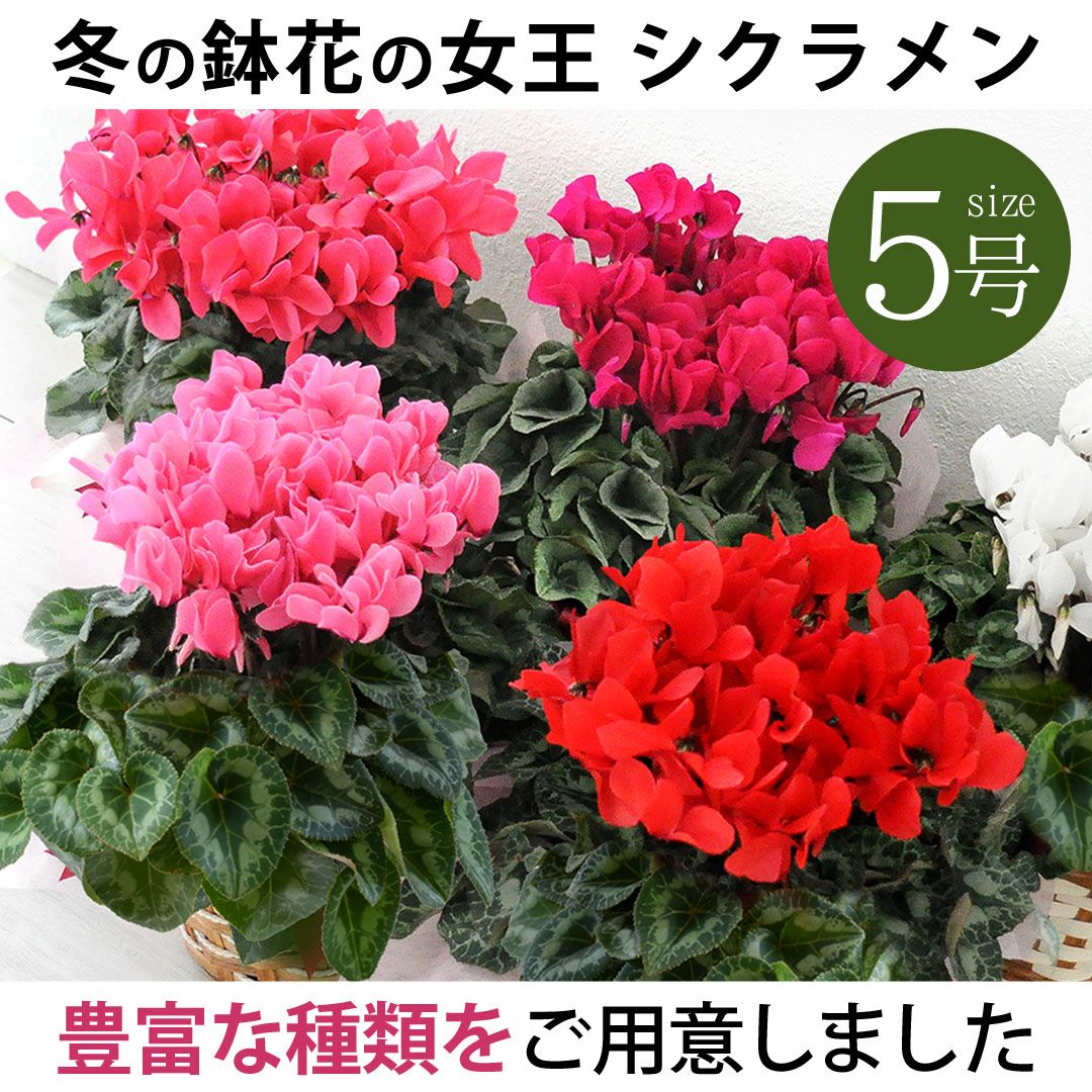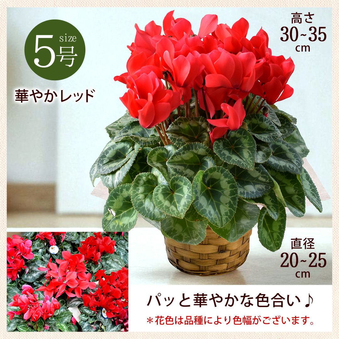 他の画像を見る 送料無料 鉢植え 贈り物にも人気のシクラメン 鉢植え 品種が選べる シクラメン 鉢植え 5号鉢 <バスケット付> 【11月29日~12月25日のお届け】 送料無料 当店特別価格 ¥ 4,480 税込 会員価格あり Web会員様特別価格 ¥ 4,255 税込 在庫切れ 詳細を見る お気に入りに登録する