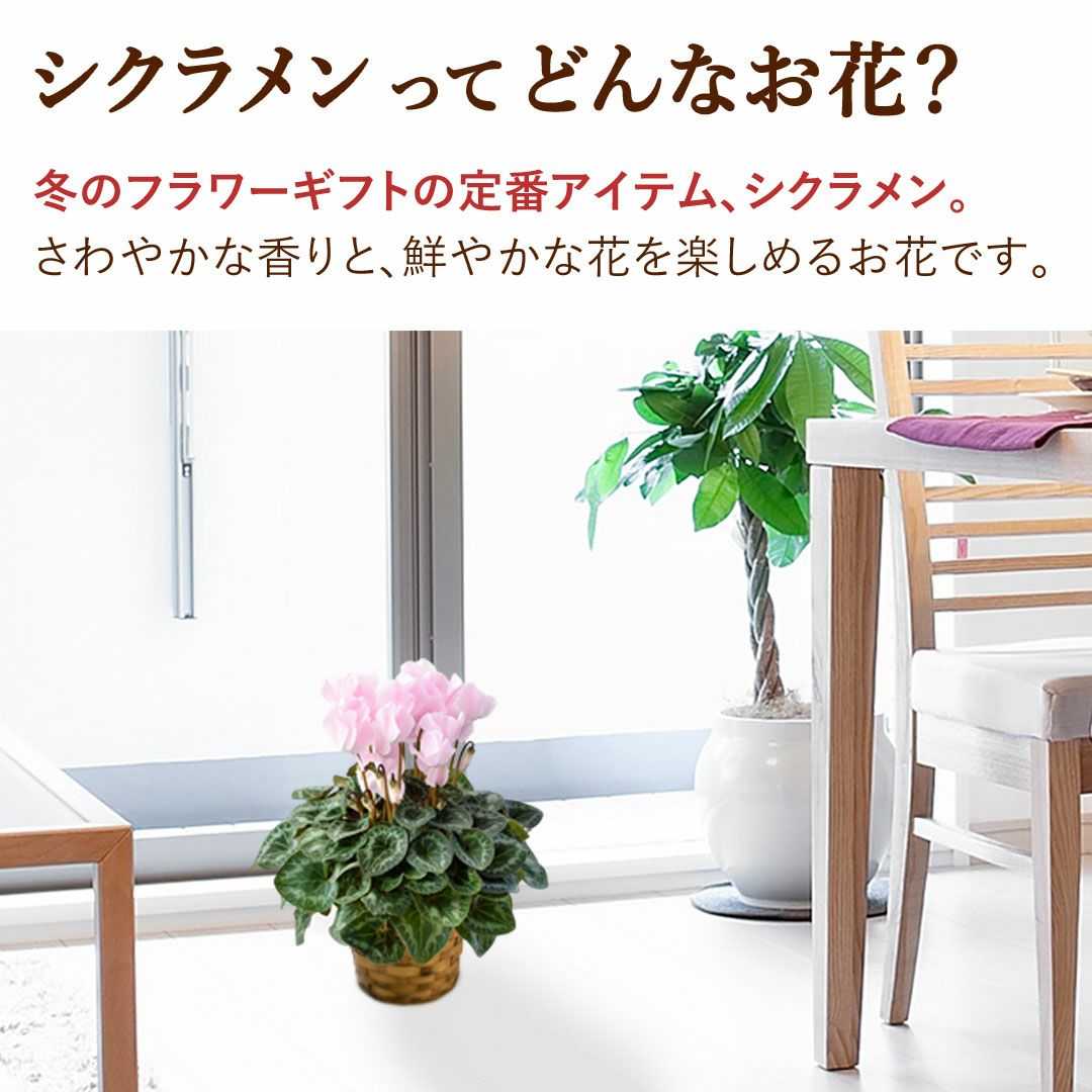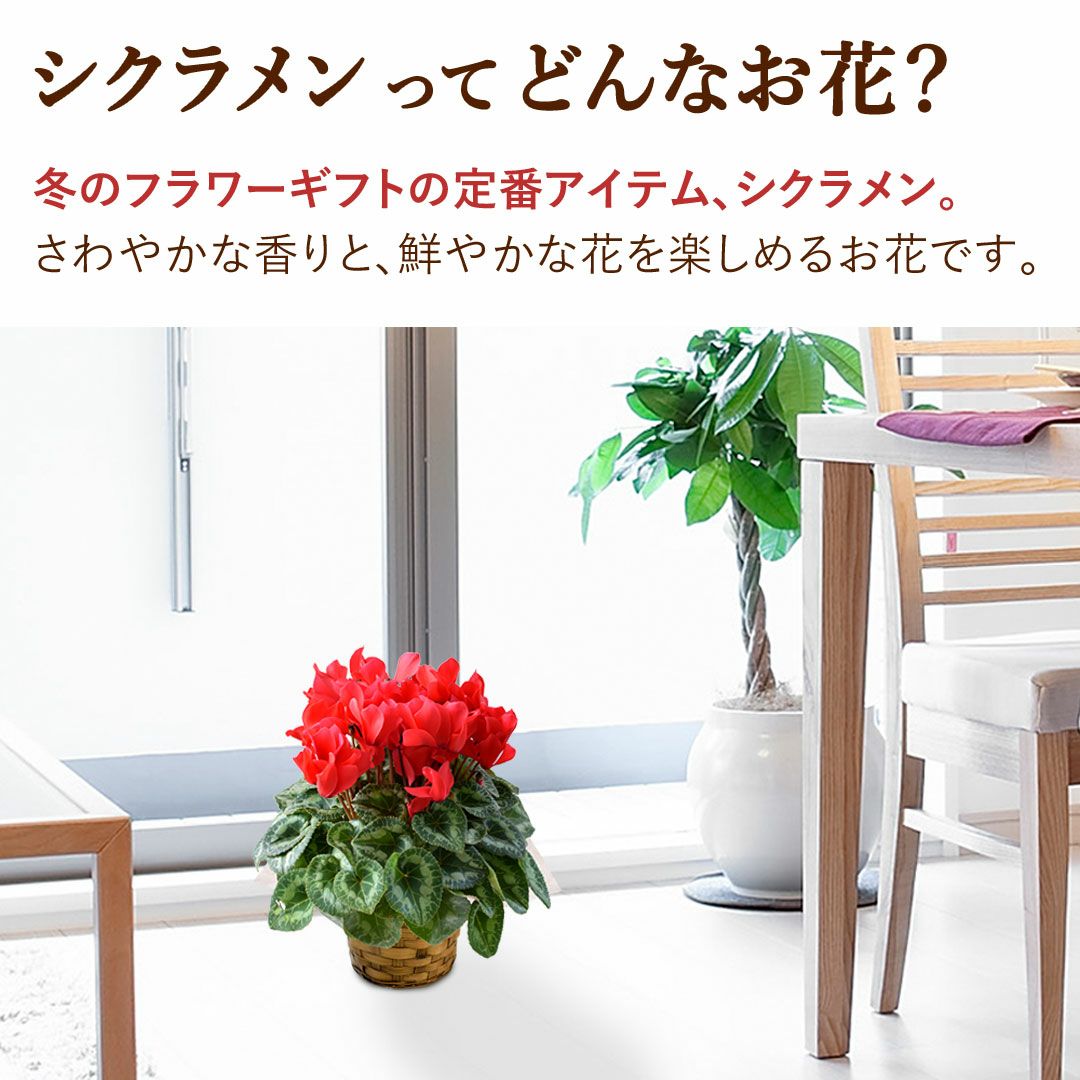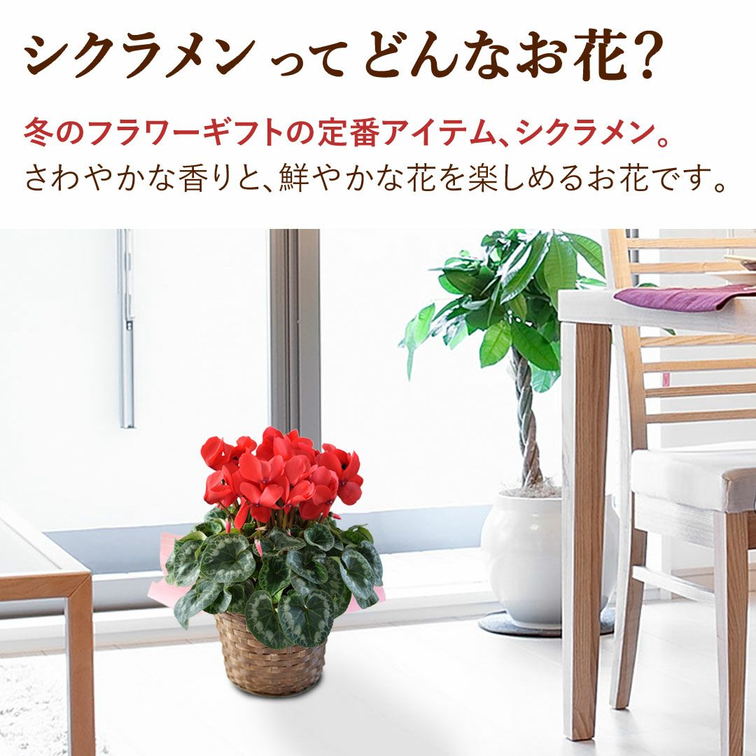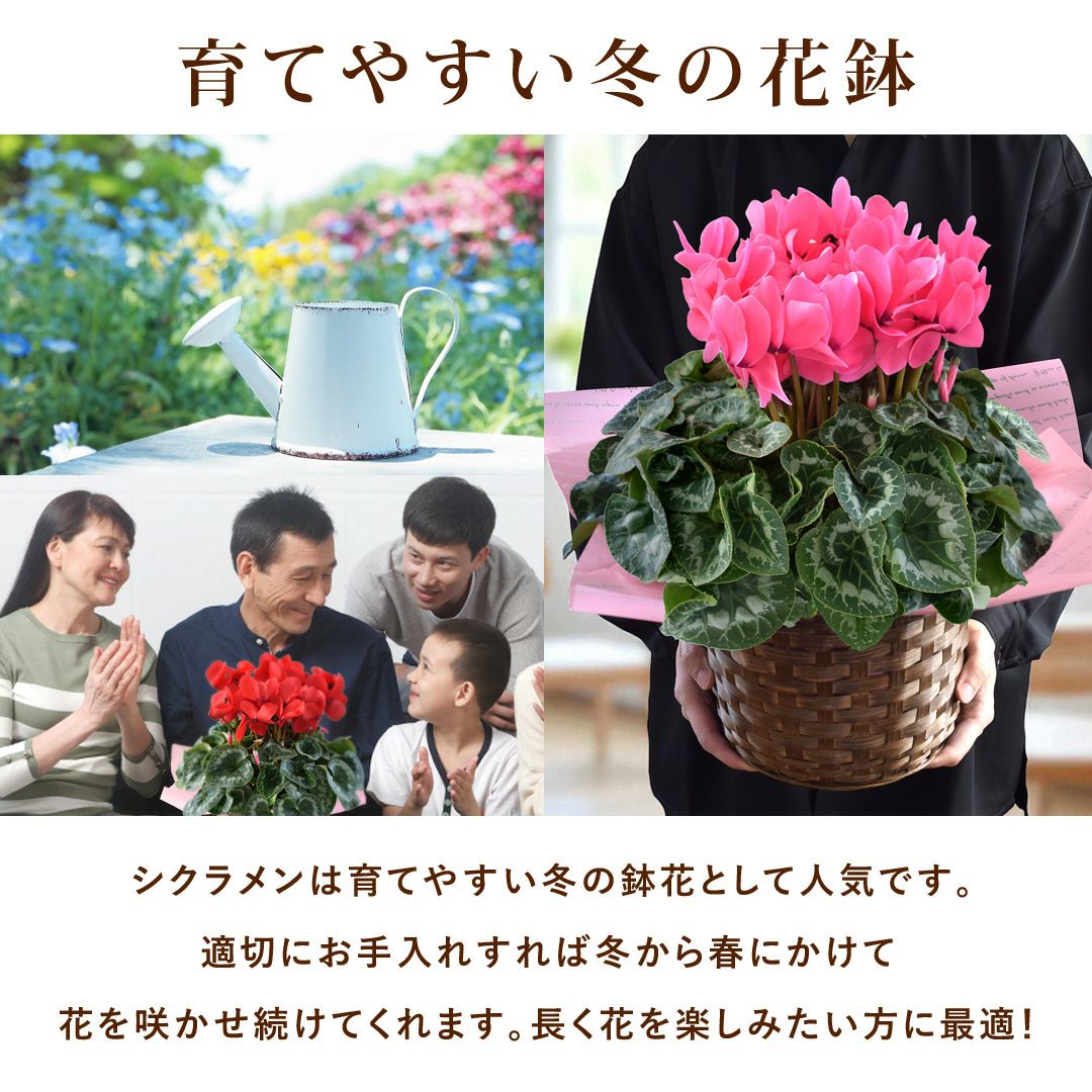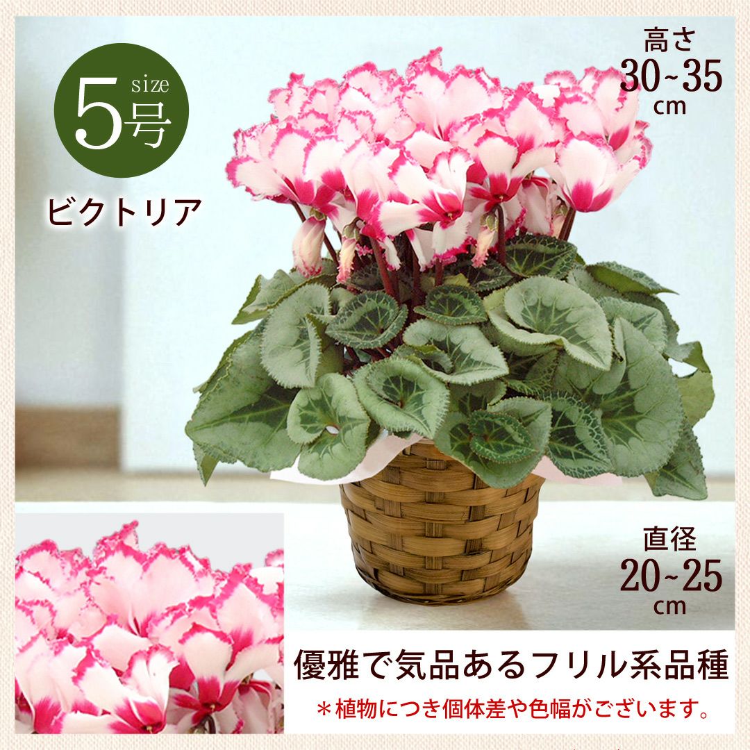 他の画像を見る 送料無料 鉢植え 贈り物にも人気のシクラメン 鉢植え 品種が選べる シクラメン 鉢植え 5号鉢 <バスケット付> 【11月29日~12月25日のお届け】 送料無料 当店特別価格 ¥ 4,480 税込 会員価格あり Web会員様特別価格 ¥ 4,255 税込 在庫切れ 詳細を見る お気に入りに登録する