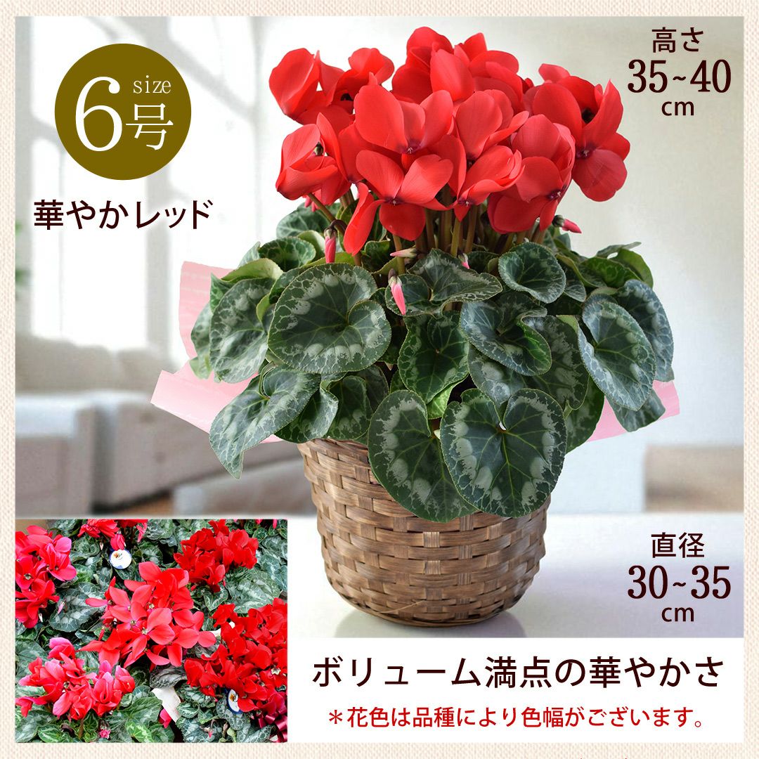 他の画像を見る 送料無料 鉢植え 御歳暮・クリスマス・誕生日プレゼントに! 鉢植え シクラメン 6号鉢 <バスケット付> 【11月29日~12月25日のお届け】 送料無料 当店特別価格 ¥ 6,190 税込 会員価格あり Web会員様特別価格 ¥ 5,880 税込 在庫切れ 詳細を見る お気に入りに登録する
