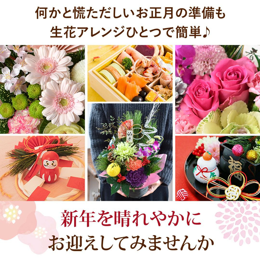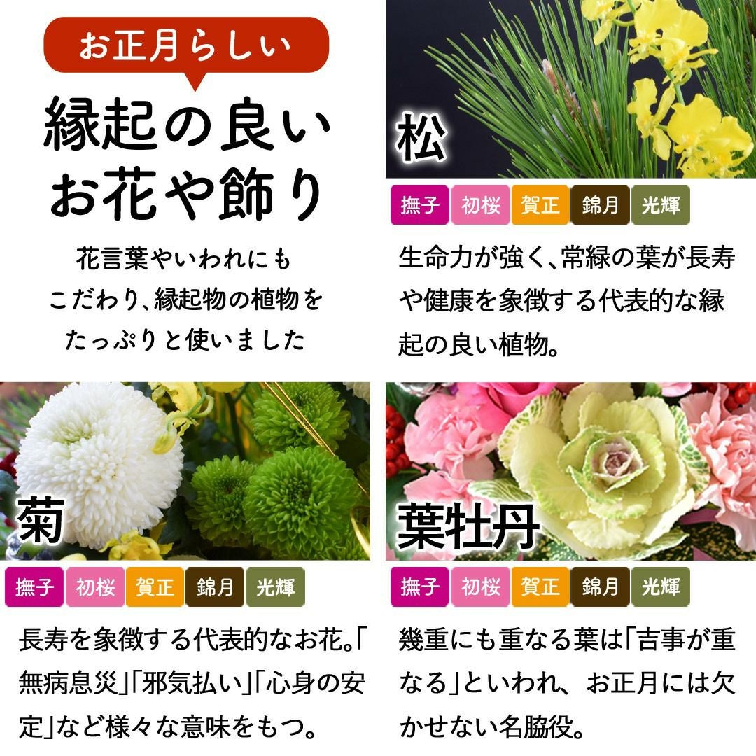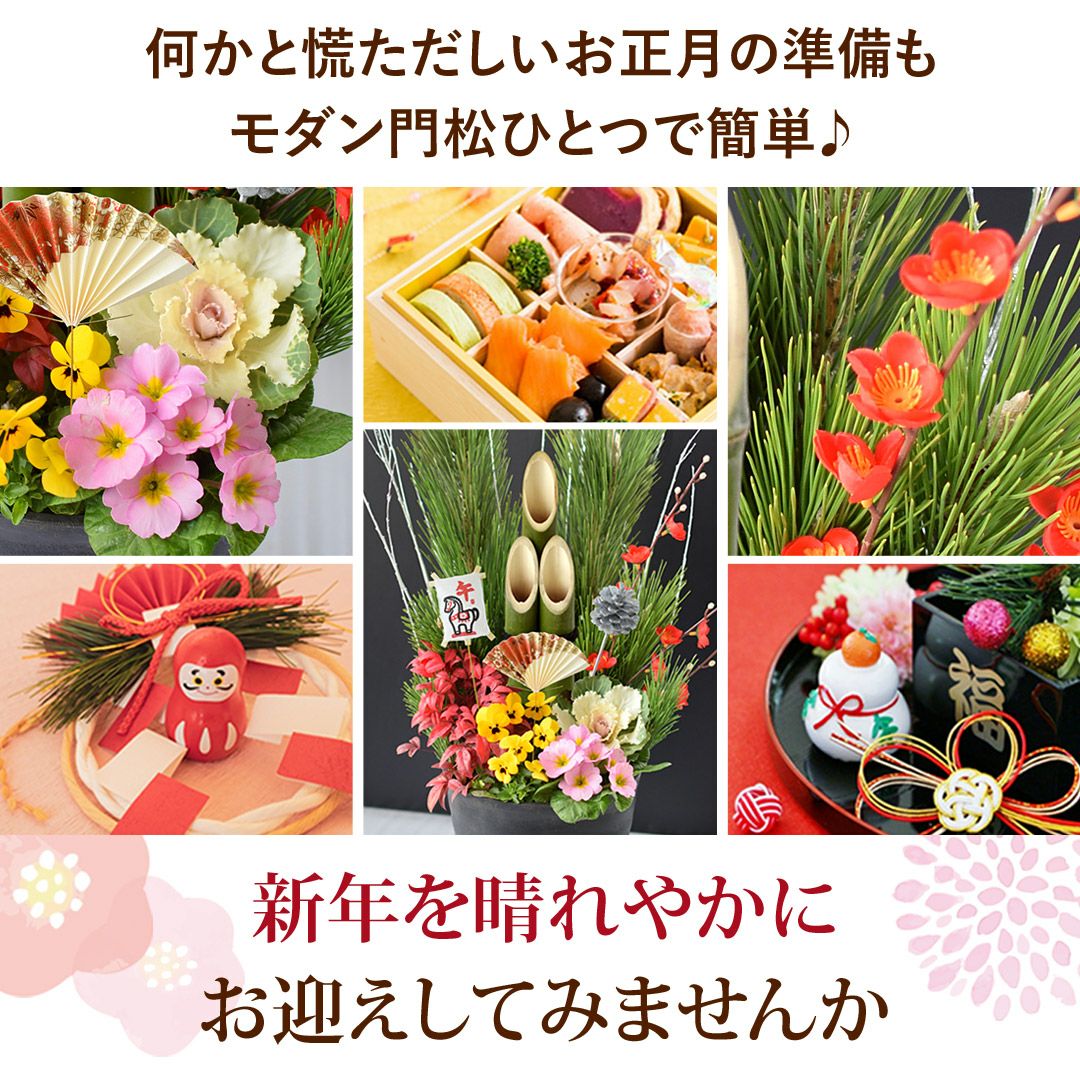 他の画像を見る おしゃれ&モダンなお正月生花アレンジ 正月飾り 2026 お正月 5種から選べる生花アレンジメント 12/28~/31の間にお届け 当店特別価格 ¥ 4,980 税込 会員価格あり Web会員様特別価格 ¥ 4,731 税込 在庫切れ 詳細を見る お気に入りに登録する