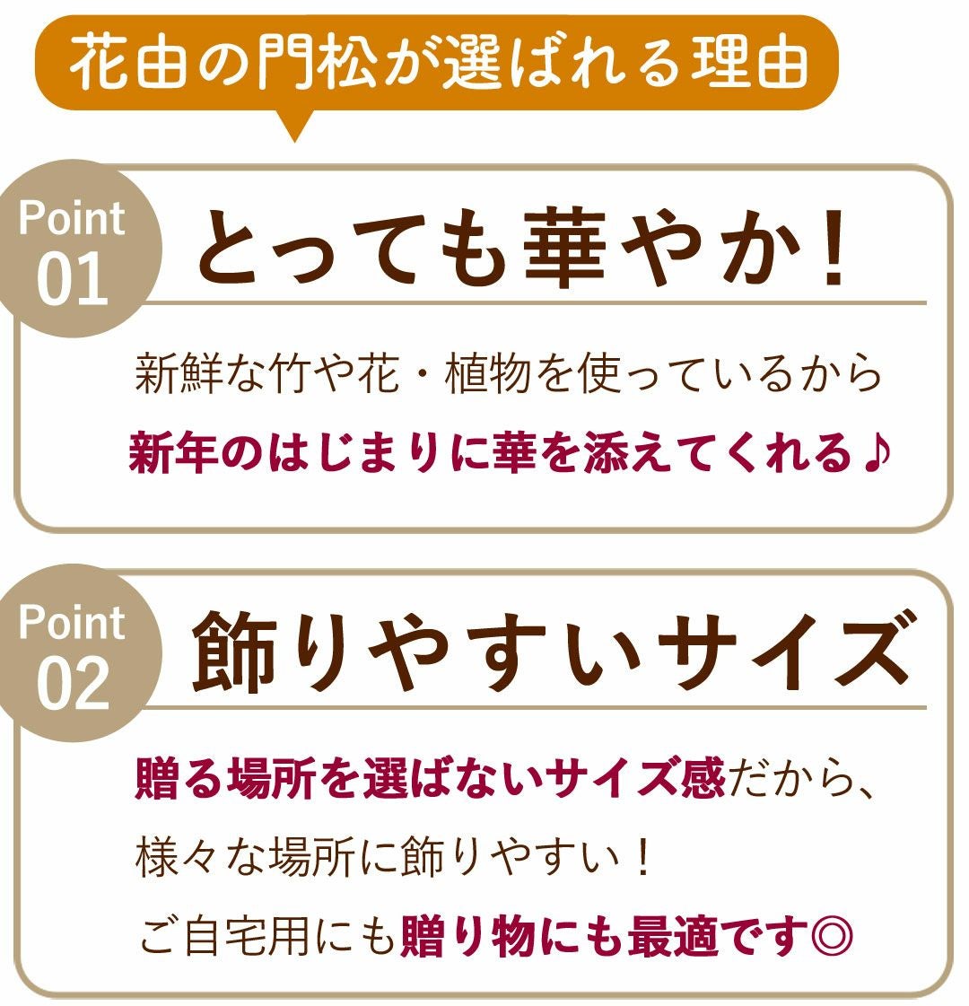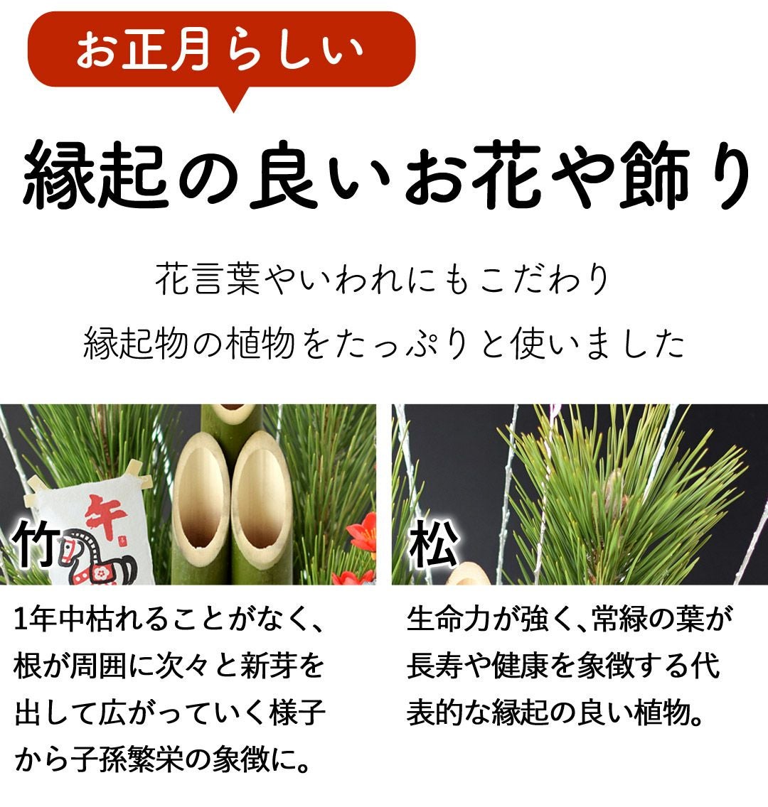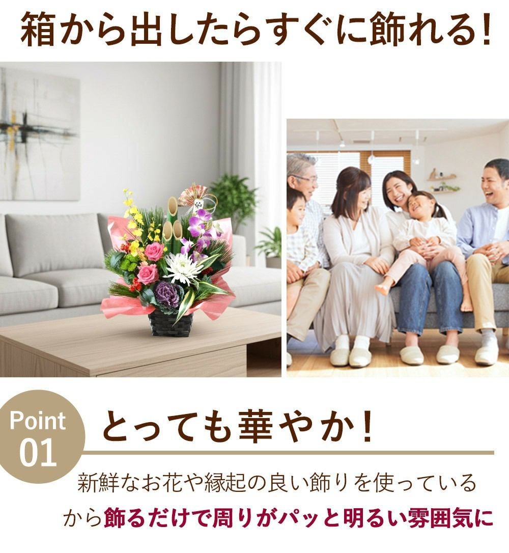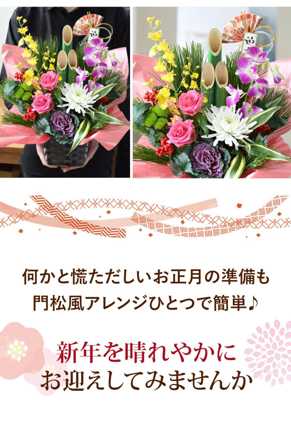 他の画像を見る 送料無料 生花アレンジ 年末お届け限定 お正月に縁起の良いお花たちがたっぷり お正月 2026 生花アレンジメント 門松風生花アレンジ~花結び 桃 12/28~12/31の間で指定OK! 当店特別価格 ¥ 6,980 税込 会員価格あり Web会員様特別価格 ¥ 6,630 税込 在庫切れ 詳細を見る お気に入りに登録する