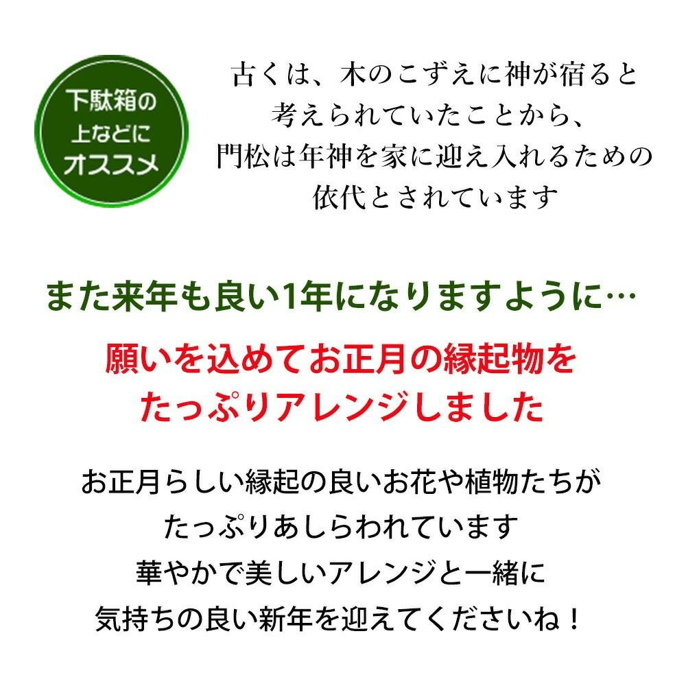 他の画像を見る 送料無料 生花アレンジ 年末お届け限定 当店人気の門松風生花アレンジ豪華バージョン♪ お正月 2026 生花アレンジメント~花友禅 12/28~12/31の間で日時指定OK! 当店特別価格 ¥ 8,990 税込 会員価格あり Web会員様特別価格 ¥ 8,540 税込 在庫切れ 詳細を見る お気に入りに登録する