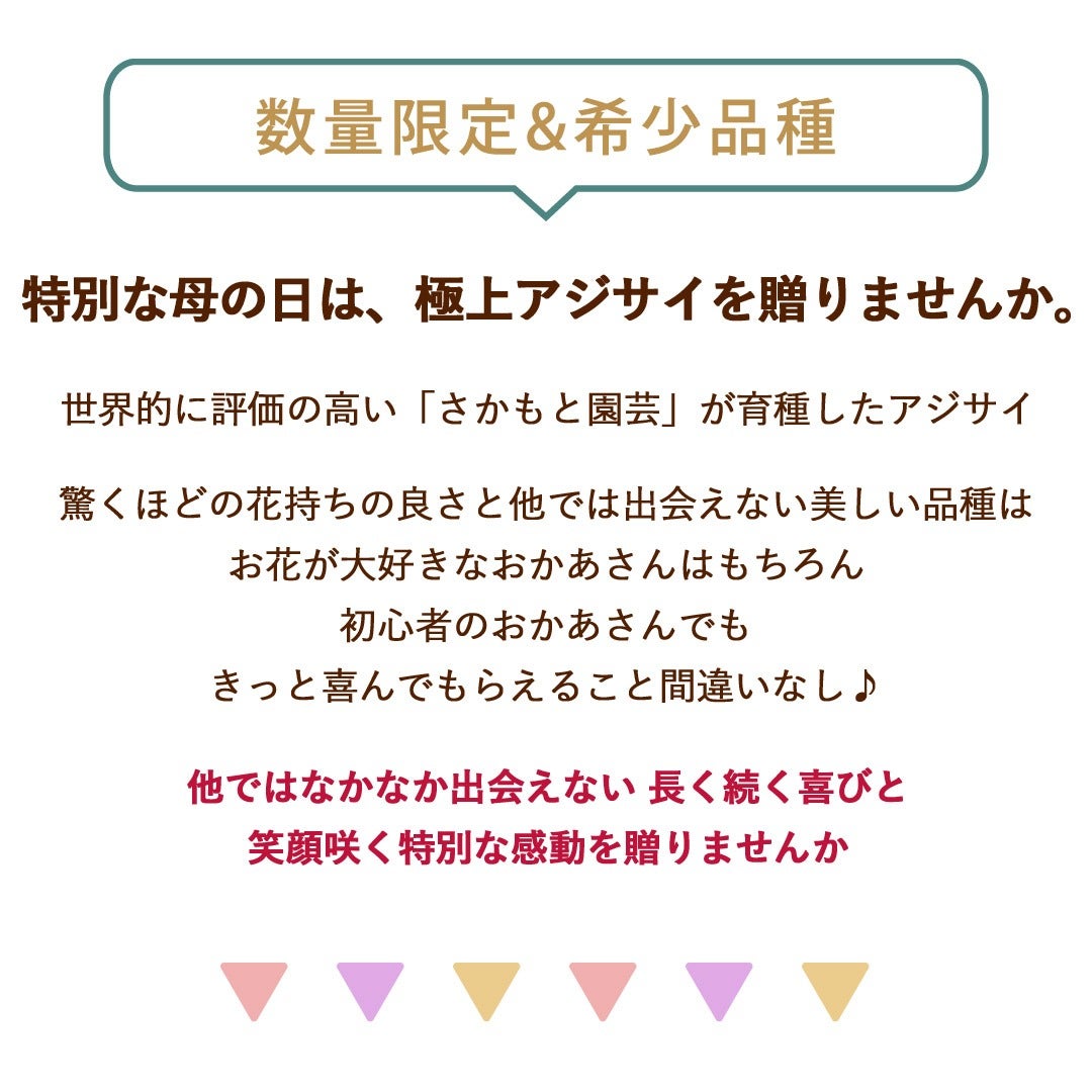 他の画像を見る 送料無料 鉢植え 母の日期間限定 アジサイで母の日後の梅雨の季節もお母さんを笑顔に♪ 母の日 2026 希少品種 さかもと園芸 プレミアム あじさい 5号鉢 in バスケット 紫陽花 アジサイ 鉢植え 花鉢 当店特別価格 ¥ 6,980 税込 詳細を見る お気に入りに登録する