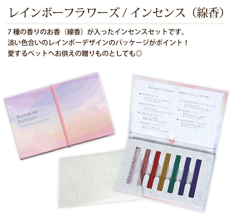 他の画像を見る セット商品 プラスワン お供え お彼岸 法事 命日 一周忌 お悔やみ お盆 お供え物 【お花にプラスワン】レインボーフラワーズ 7種の香りのお線香セット(※線香セットのみの購入はできません※ 当店特別価格 ¥ 1,595 税込 詳細を見る お気に入りに登録する