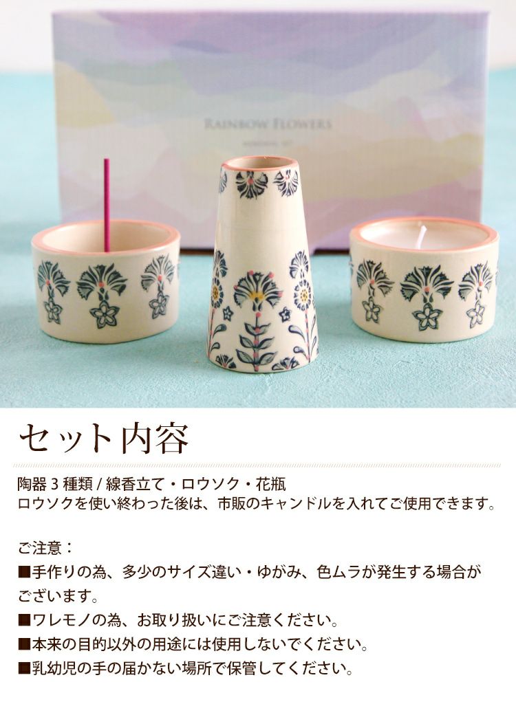 他の画像を見る セット商品 プラスワン お供え お彼岸 法事 命日 一周忌 お悔やみ お盆 お供え物 【お花にプラスワン】メモリアルセット《仏具・花器3点セット》&レインボーフラワーズ《7種の香りのお線香セット》陶器製 キャンドル お香立て 花瓶 セット 仏具 花器(※メモリアルセットのみの購入はできません※ 当店特別価格 ¥ 3,685 税込 詳細を見る お気に入りに登録する
