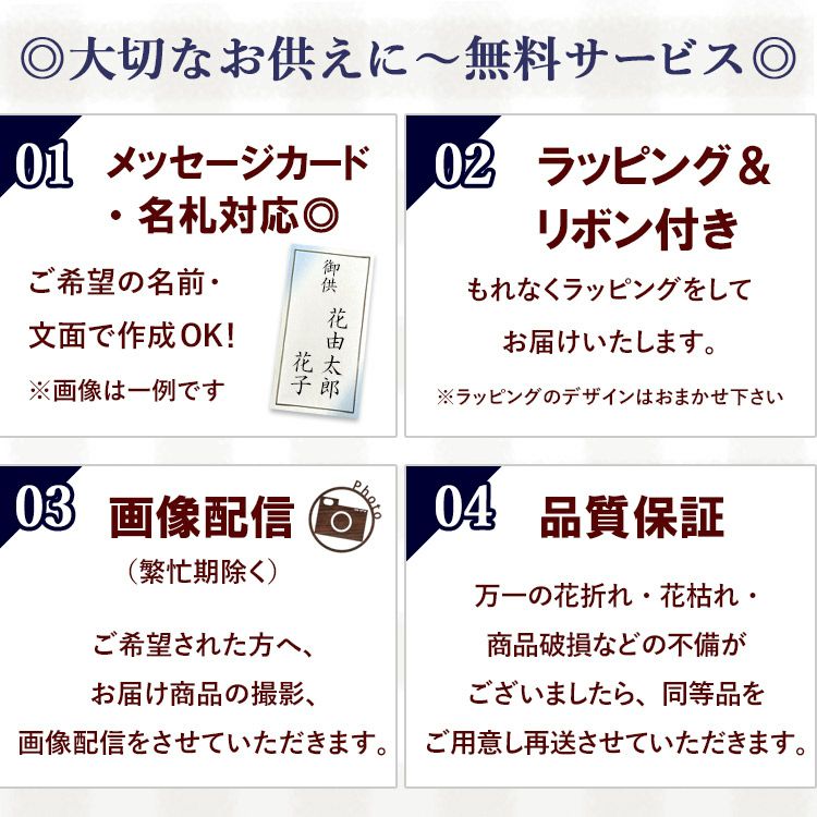 他の画像を見る 即日発送 送料無料 お供え用 生花アレンジ お供え生花 アレンジメント ~ユリ入LLサイズ お盆 新盆 初盆 お彼岸 翌日配達 当店特別価格 ¥ 12,100 税込 会員価格あり Web会員様特別価格 ¥ 11,495 税込 詳細を見る お気に入りに登録する