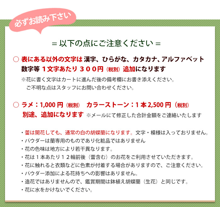 ・蕾は開花しても、通常の白の胡蝶蘭になります。文字・模様は入っておりません。