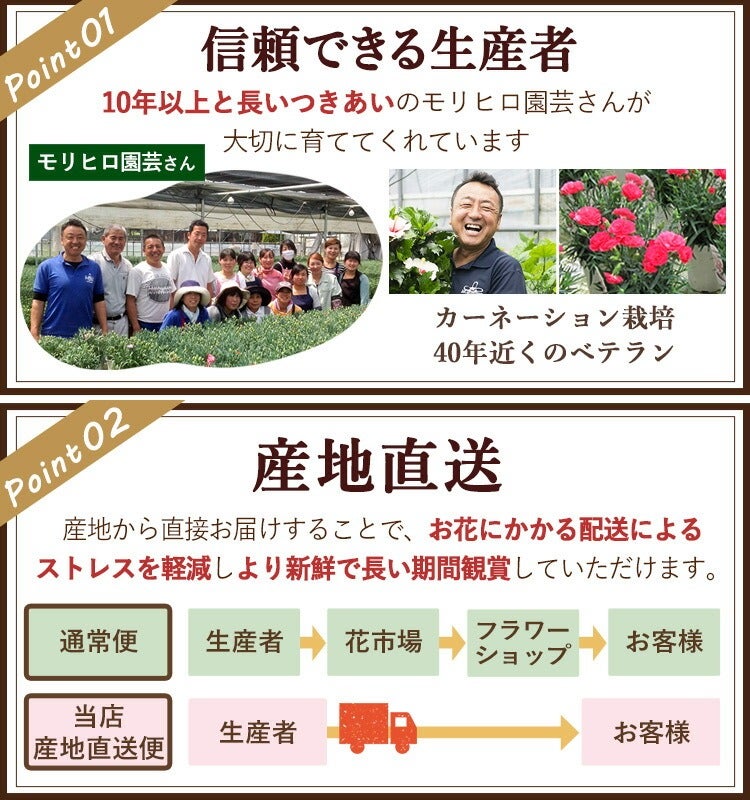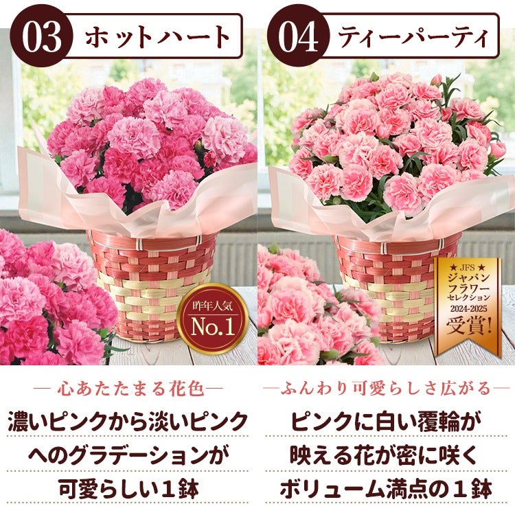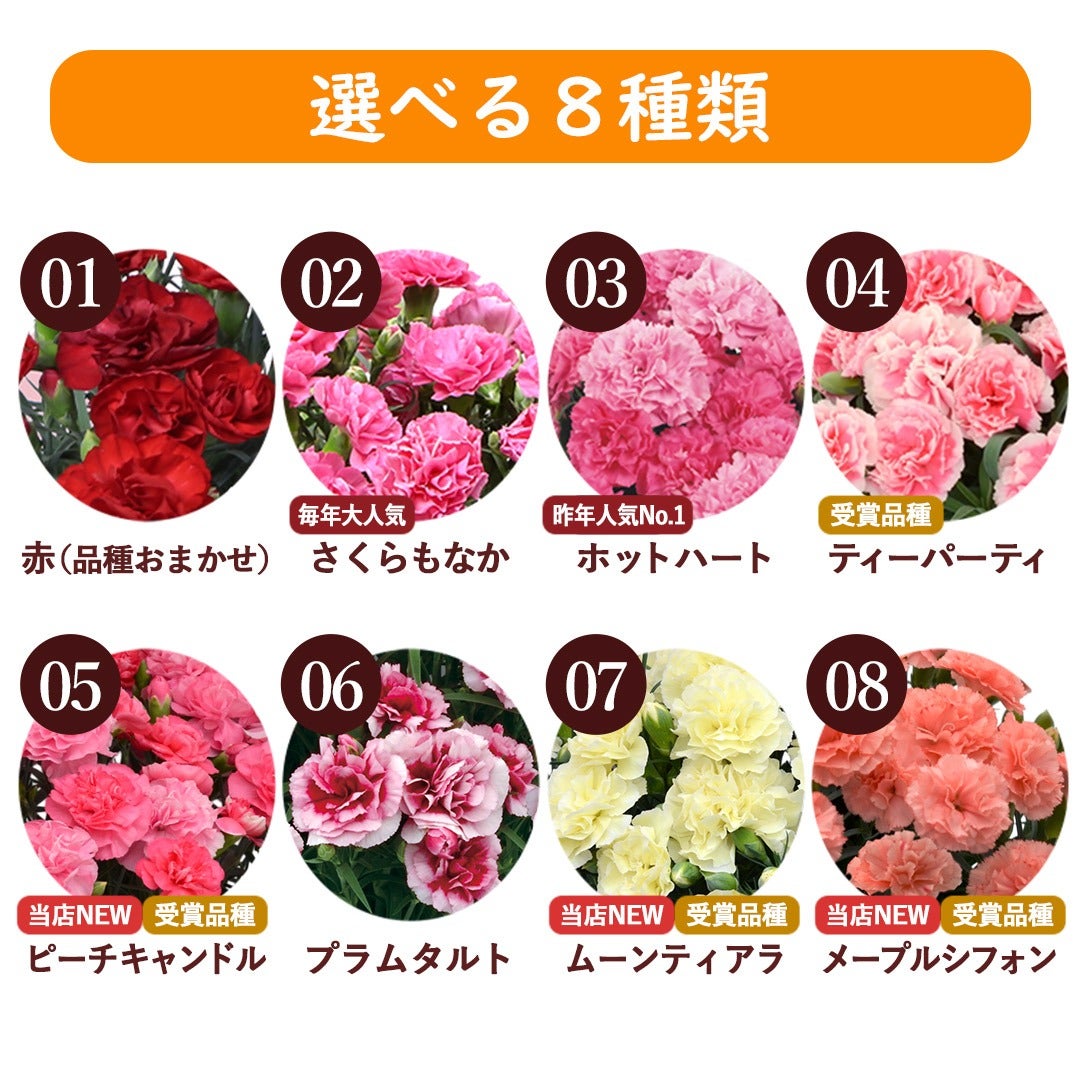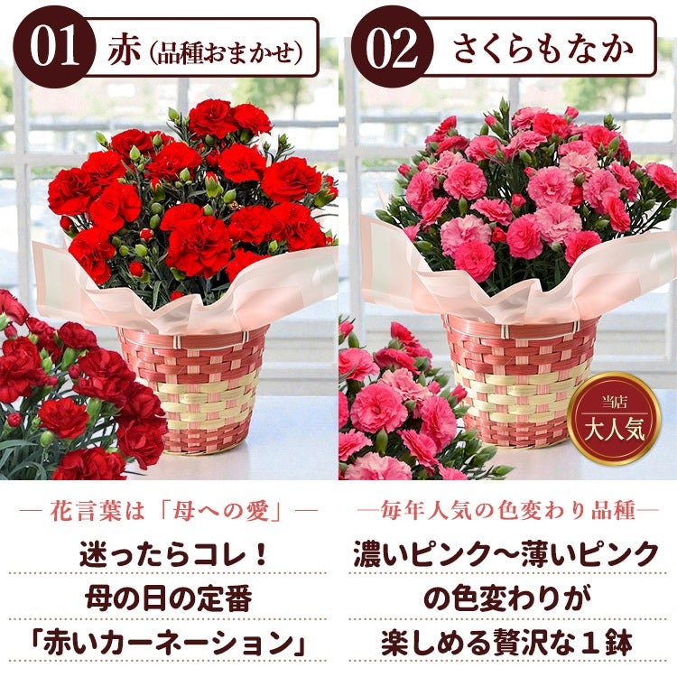 他の画像を見る 送料無料 鉢植え 母の日期間限定 母の日 新種や希少カーネーション登場! 超早割 母の日 2026 産地直送 選べる8種類 モリヒロ園芸さんのプレミアム カーネーション 鉢植え 5号鉢 in バスケット 当店特別価格 ¥ 2,979 税込 詳細を見る お気に入りに登録する