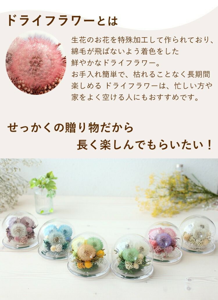 他の画像を見る 即日発送 送料無料 誕生日 プリザーブドフラワー おしゃれな方への贈り物に プリザーブドフラワー ドライフラワー たんぽぽのガラスドーム 当店特別価格 ¥ 4,730 税込 会員価格あり Web会員様特別価格 ¥ 4,493 税込 詳細を見る お気に入りに登録する