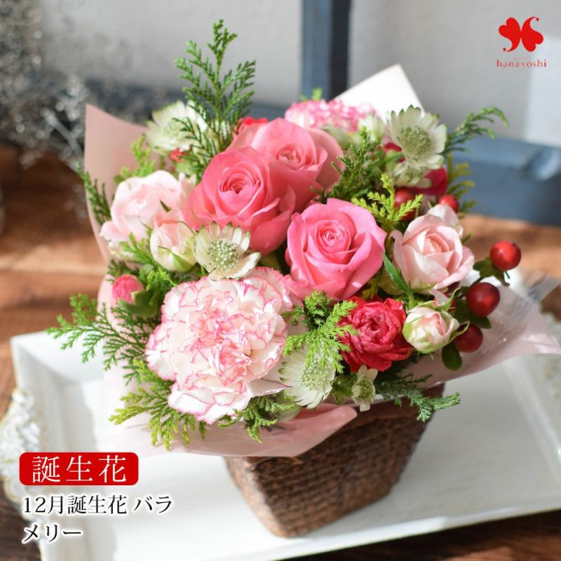 誕生花を使ったアレンジメント 12月 バラ 誕生月の生花アレンジ 「メリー」