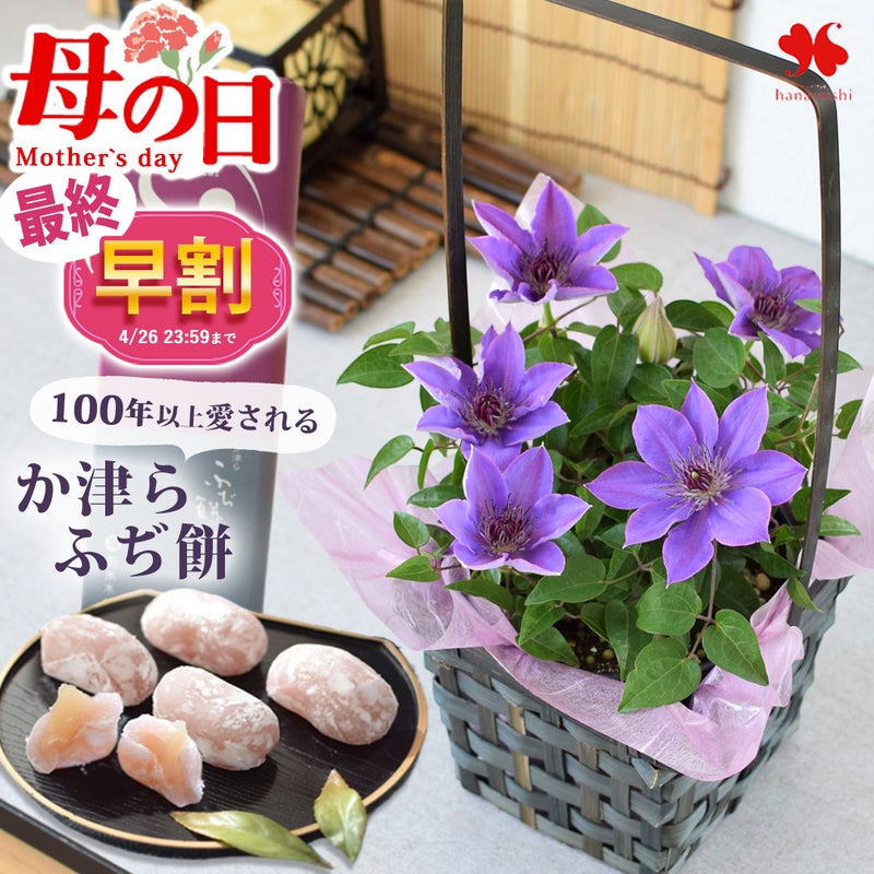 早割 母の日 2026 クレマチス 和風籠 & 徳島 名物 老舗 銘菓 絶品 ふぢ餅 セット