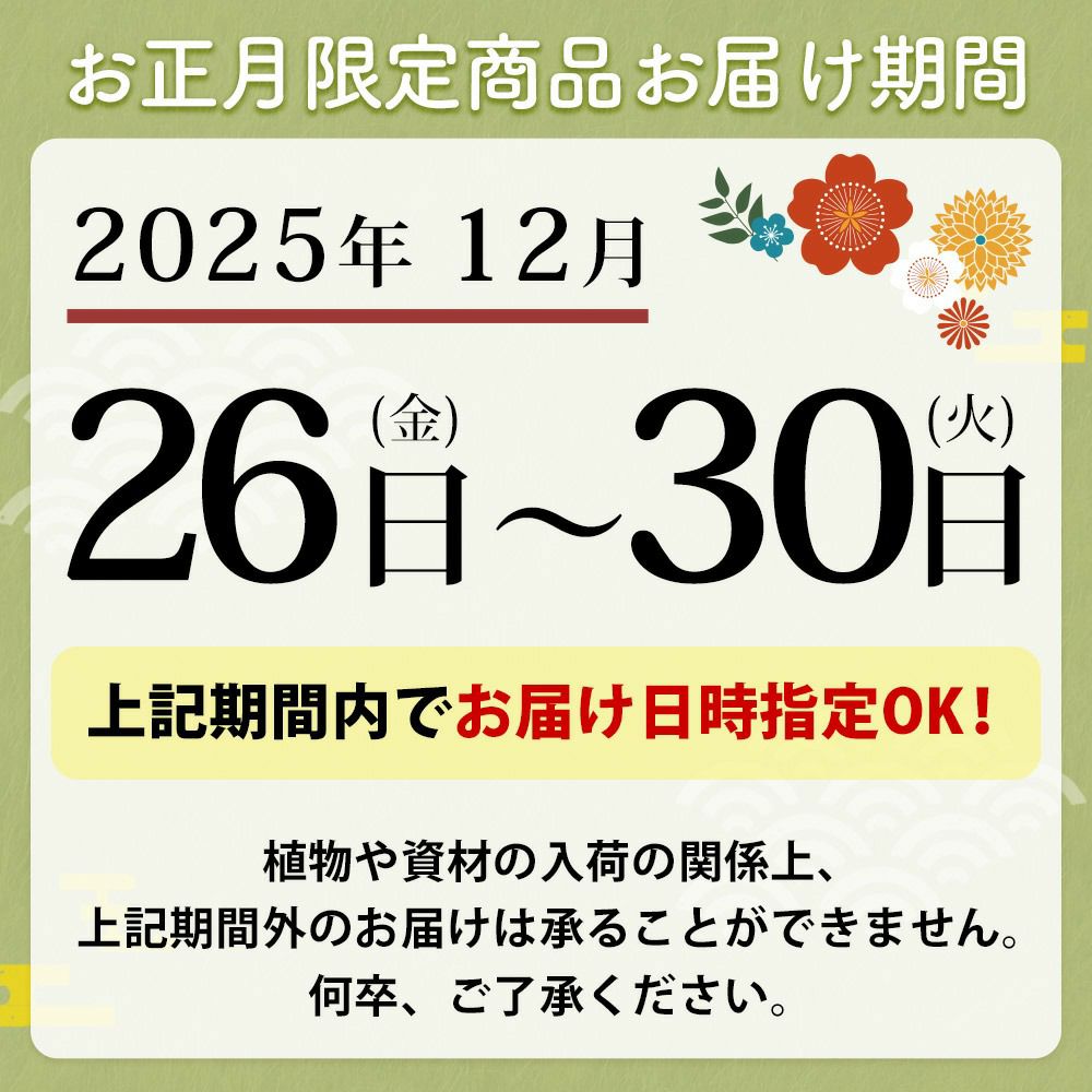 他の画像を見る 送料無料 寄せ植え 年末お届け限定 お正月が終わったら竹を外して寄せ植えに変身! お正月 2026 門松 寄せ植え スタイリッシュなモダン門松 12/26~12/30の間で指定OK! 当店特別価格 ¥ 6,980 税込 会員価格あり Web会員様特別価格 ¥ 6,631 税込 在庫切れ 詳細を見る お気に入りに登録する