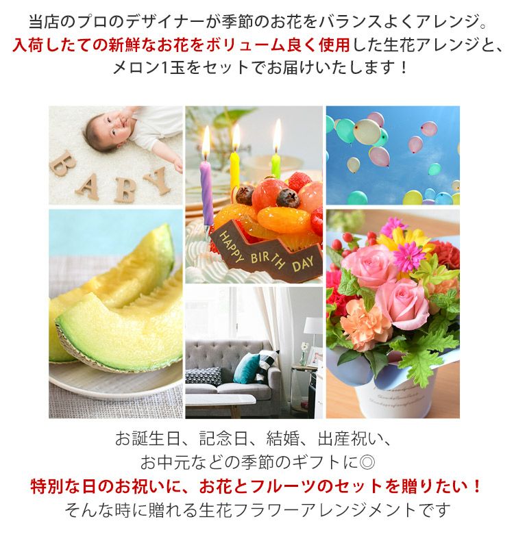 他の画像を見る 送料無料 セット商品 生花アレンジ 旬の生花を使って花由のデザイナーがアレンジ! バラと季節の花 おまかせ生花アレンジ Sサイズ & メロン1玉 当店特別価格 ¥ 9,890 税込 会員価格あり Web会員様特別価格 ¥ 9,395 税込 在庫切れ 詳細を見る お気に入りに登録する