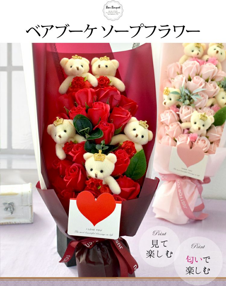 【見て楽しむ・香りで楽しむ ソープフラワー くま花束タイプ】