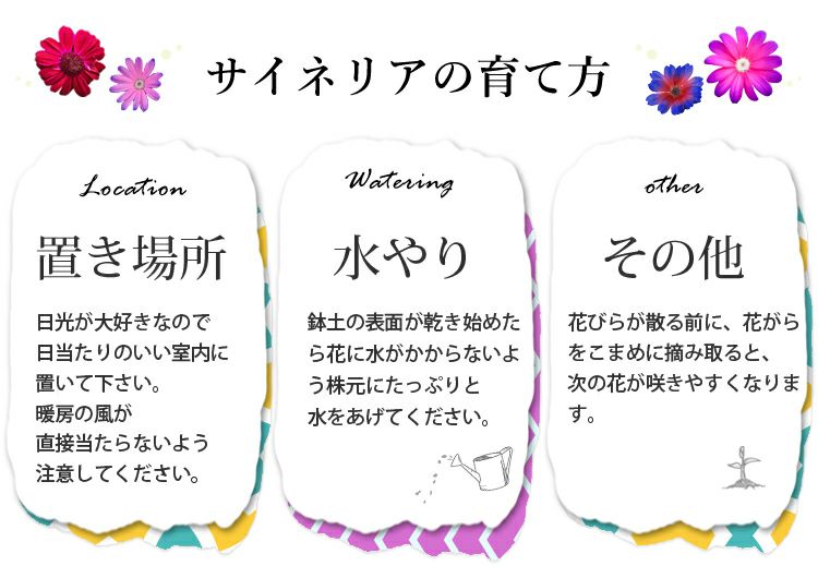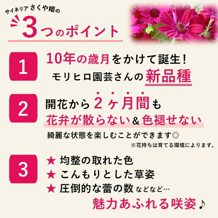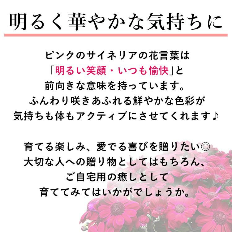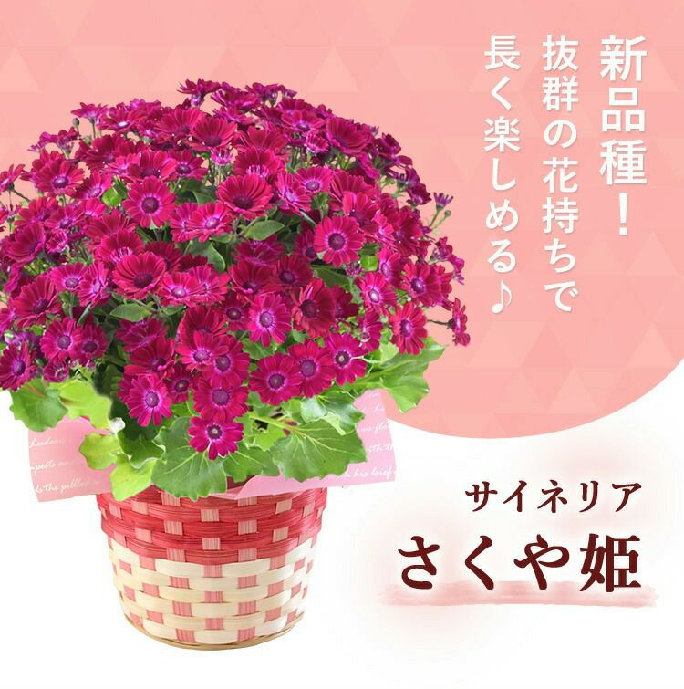 他の画像を見る 即日発送 送料無料 鉢植え 大きくて丈夫!季節の鉢花ギフト モリヒロ園芸さんの季節の鉢花 送料無料 サイネリア さくや姫 2/15~3/14お届け 当店特別価格 ¥ 4,280 税込 会員価格あり Web会員様特別価格 ¥ 4,065 税込 在庫切れ 詳細を見る お気に入りに登録する
