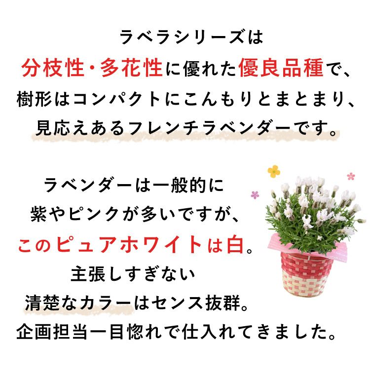 他の画像を見る 送料無料 鉢植え 香りも楽しめるギフト◎ 春の鉢花 送料無料 ラベンダー ラベラ ピュアホワイト 5号鉢 3/8~4/11お届け 当店特別価格 ¥ 4,530 税込 会員価格あり Web会員様特別価格 ¥ 4,304 税込 在庫切れ 詳細を見る お気に入りに登録する