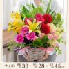 ■季節の花各種、グリーン / バスケット(デザインおまかせ) / ラッピング / お取扱い説明書 / 品質保証付きショップカード