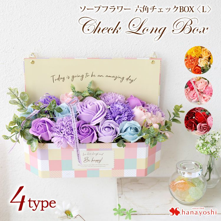 人気急上昇!ソープフラワー お誕生日・お祝い・プレゼントなどに人気 【土日も発送】 即日発送対応 ソープフラワー 六角チェックBOX <L> 選べる4カラー ボックスアレンジ