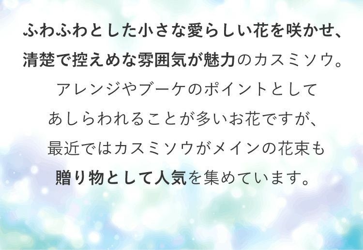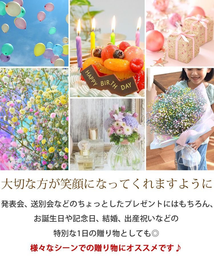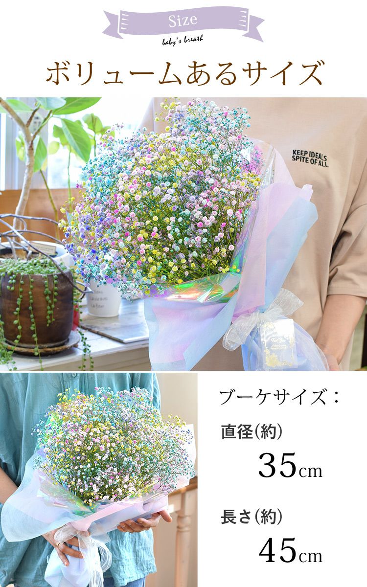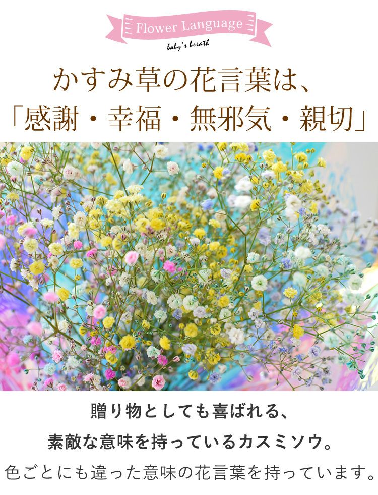 他の画像を見る 送料無料 生花花束 カラフル!かすみ草の花束♪大きめMサイズ かすみ草のブーケM カスミソウ 当店特別価格 ¥ 4,980 税込 会員価格あり Web会員様特別価格 ¥ 4,732 税込 詳細を見る お気に入りに登録する
