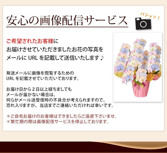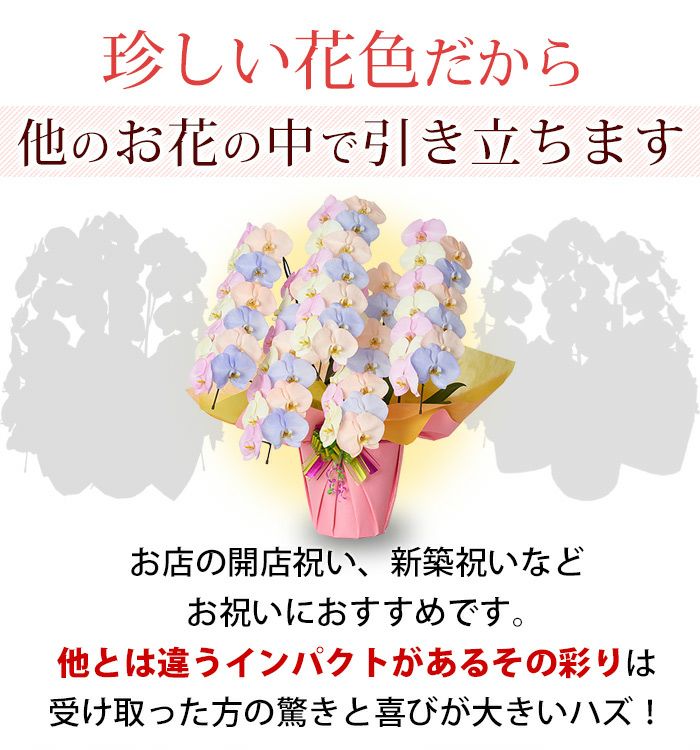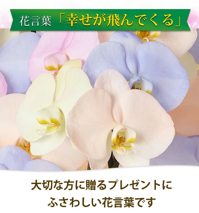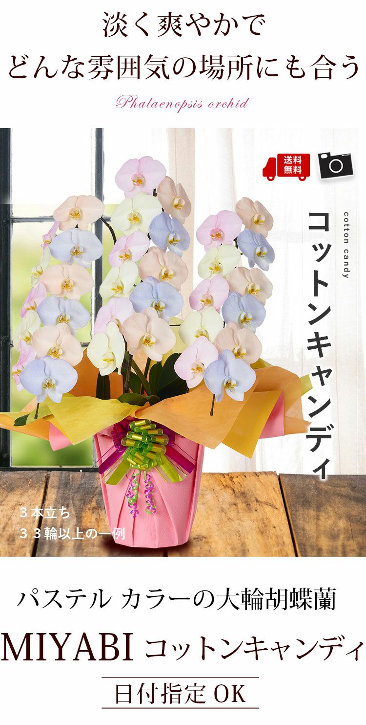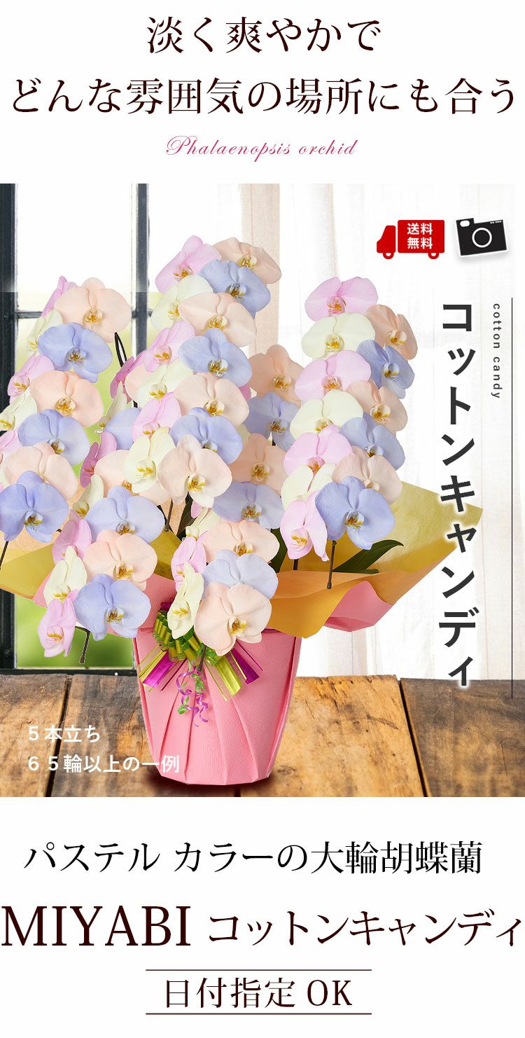 他の画像を見る 送料無料 誕生日 花言葉は「幸せが飛んでくる」 !産地直送!胡蝶蘭◎ 産地直送!リーフさんの カラー胡蝶蘭 コットンキャンディ MIYABI<大輪・3本立ち> 30輪以上 当店特別価格 ¥ 39,600 税込 詳細を見る お気に入りに登録する