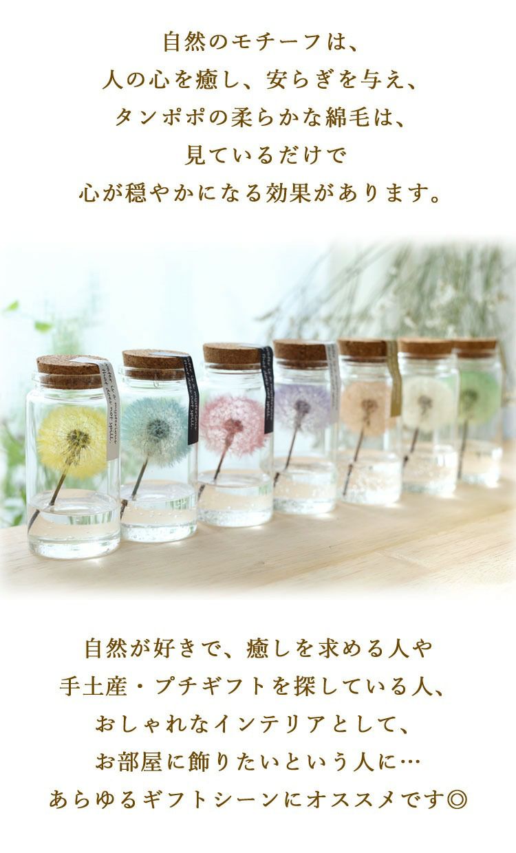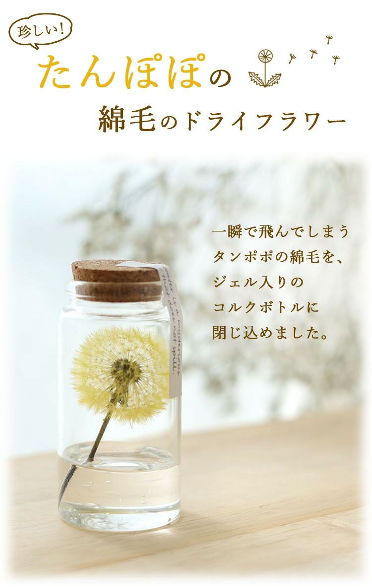 他の画像を見る 即日発送 誕生日 ドライフラワー おしゃれな方への贈り物に ドライフラワー ふわふわたんぽぽミニボトル 3個以上で送料無料<1配送先に限る> 当店特別価格 ¥ 1,760 税込 会員価格あり Web会員様特別価格 ¥ 1,672 税込 詳細を見る お気に入りに登録する