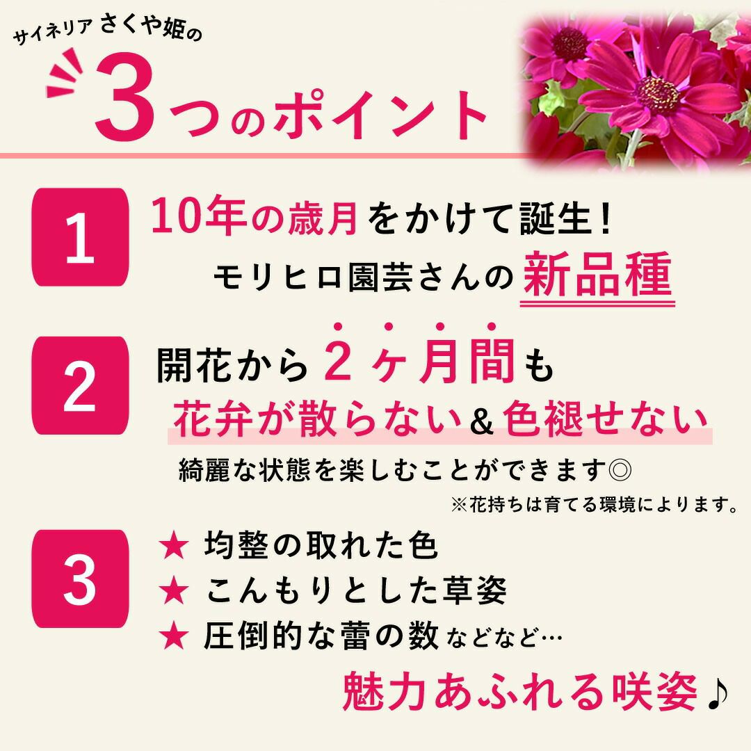 他の画像を見る 即日発送 送料無料 鉢植え 大きくて丈夫!季節の鉢花ギフト モリヒロ園芸さんの季節の鉢花 送料無料 プレミアム サイネリア ティア・ウィッチ さくや姫 当店特別価格 ¥ 4,980 税込 会員価格あり Web会員様特別価格 ¥ 4,731 税込 詳細を見る お気に入りに登録する