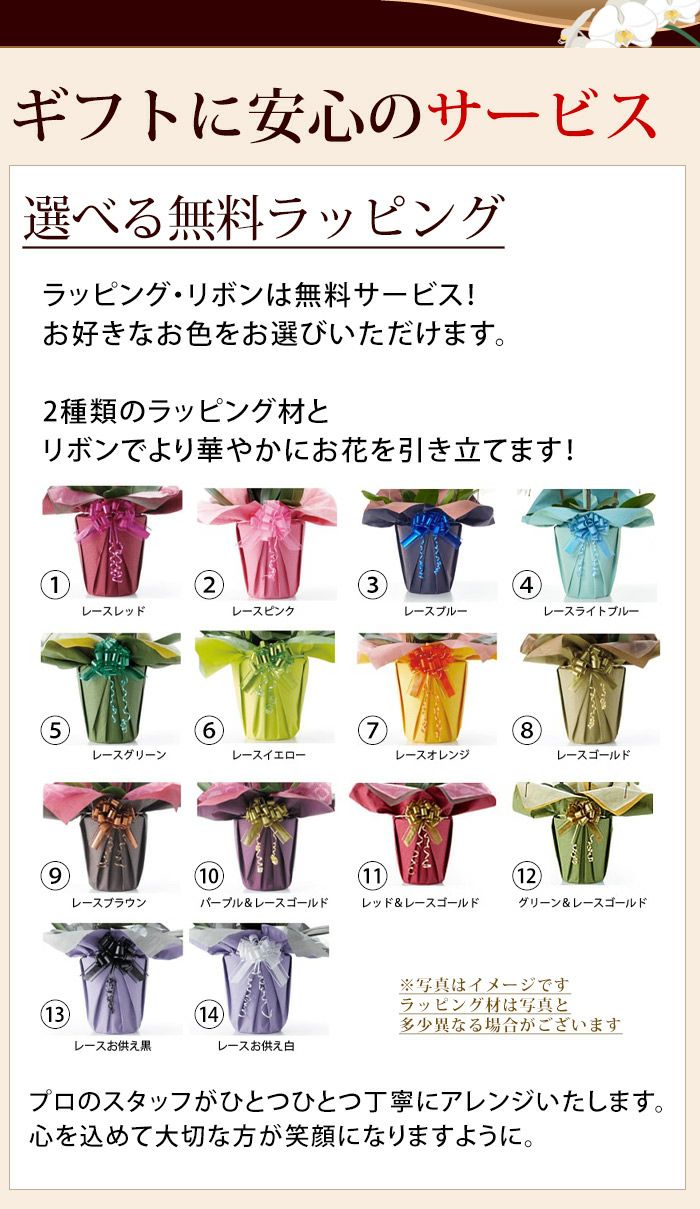■ラッピング・リボン / ご希望の方に名札・メッセージカード / 育て方レシピ / 画像配信サービス / 品質保証付ショップカード