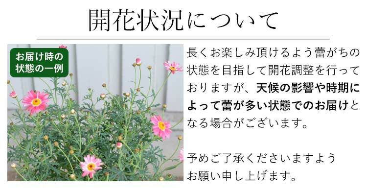 他の画像を見る 送料無料 鉢植え 毎年大好評の色変わりが可愛いマーガレットの人気品種! 春の鉢花 送料無料 マーガレット ストロベリーホイップ 5号鉢 ~4/27お届けまで 当店特別価格 ¥ 4,980 税込 会員価格あり Web会員様特別価格 ¥ 4,731 税込 詳細を見る お気に入りに登録する