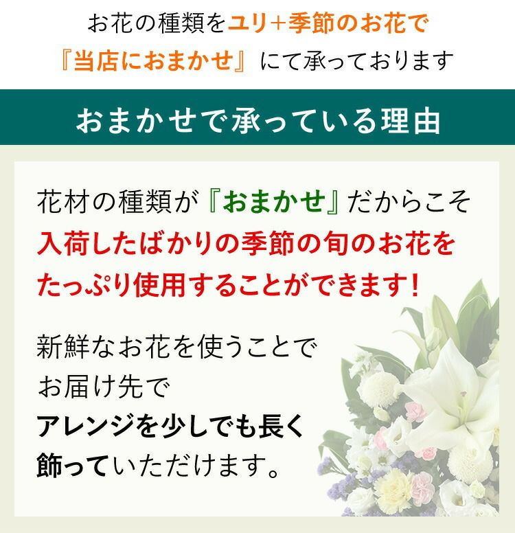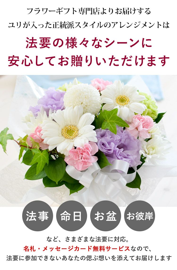 他の画像を見る 即日発送 送料無料 お供え用 生花アレンジ お供え生花 アレンジメント ~ユリ入LLサイズ お盆 新盆 初盆 お彼岸 翌日配達 当店特別価格 ¥ 12,100 税込 会員価格あり Web会員様特別価格 ¥ 11,495 税込 詳細を見る お気に入りに登録する