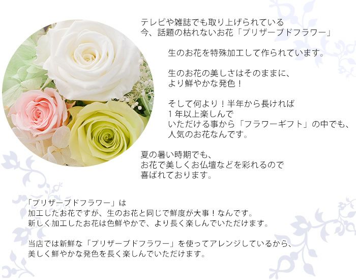他の画像を見る 即日発送 送料無料 クリアケース付 お供え用 プリザーブドフラワー 造花 枯れないお花のお供えアレンジ! お供え プリザーブドフラワー & アーティフィシャルフラワー 花愛 かんな 当店特別価格 ¥ 4,980 税込 会員価格あり Web会員様特別価格 ¥ 4,731 税込 在庫切れ 詳細を見る お気に入りに登録する