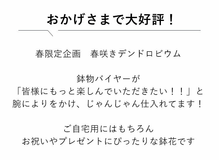 他の画像を見る 送料無料 誕生日 鉢植え ご自宅用にもギフトにもオススメ☆ 春の洋蘭 人気のピンク系 デンドロビウム ~4/20お届け 当店特別価格 ¥ 5,980 税込 会員価格あり Web会員様特別価格 ¥ 5,681 税込 在庫切れ 詳細を見る お気に入りに登録する